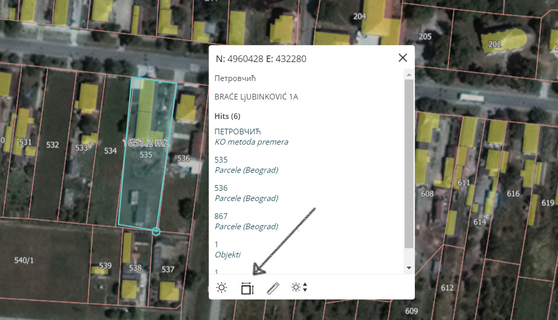 Osim ovih osnovnih podataka, dobićete uvid u tačan oblik placa ali se mogu dobiti i informacije o veličini placa tako što ćete izabrati alatku Measure area (merenje) i obeležiti površinu uz pomoć tačaka. Površina obuhvaćene površine će se pojaviti u okviru obeležene zone.