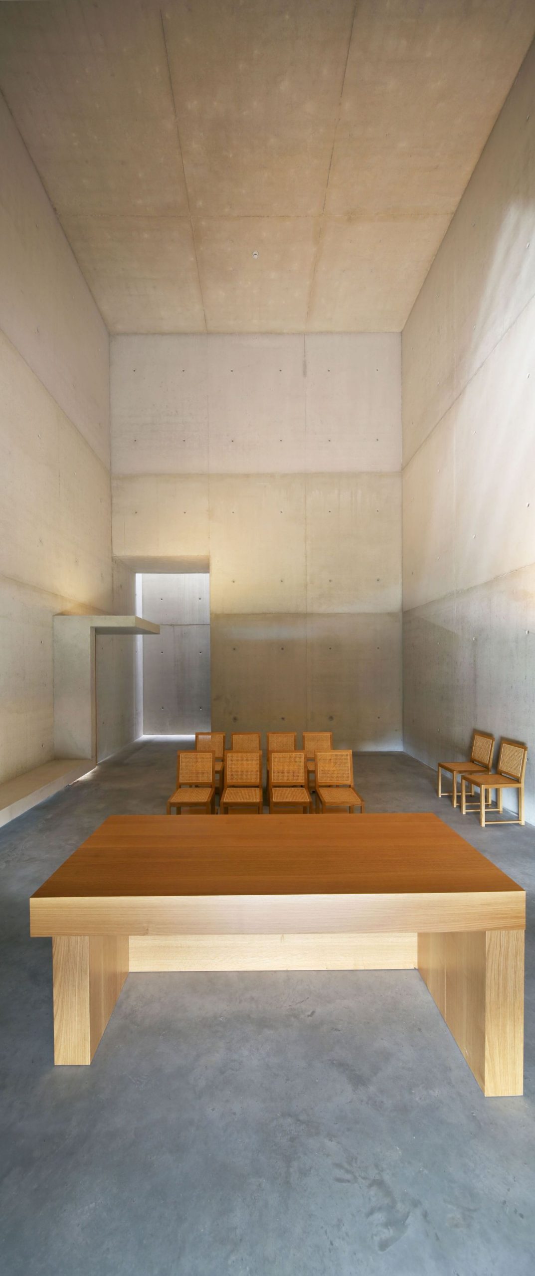 Protok prirodnog svetla omogućen je samo kroz veoma nisko postavljen horizontalni otvor iza oltara, tako da veštačko svetlo može da igra glavnu ulogu.