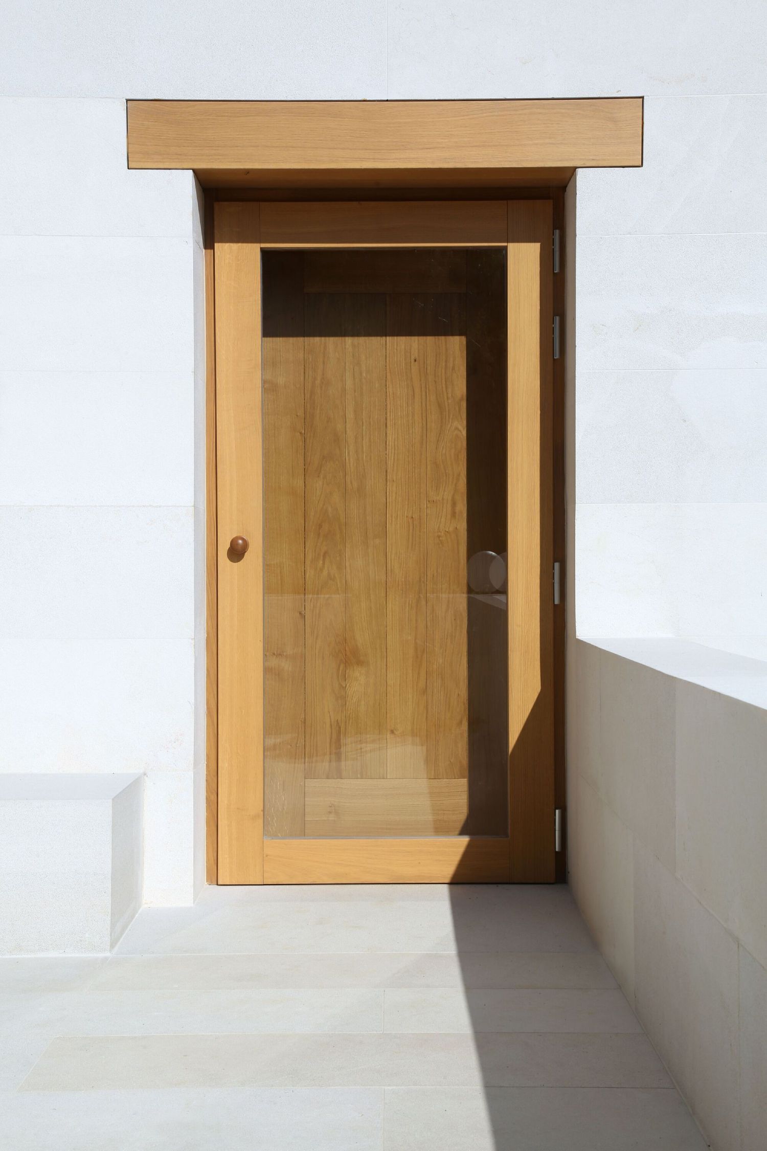 Monolitna i gotovo potpuno zatvorena struktura obložena je krečnjačkim pločama, dok sliku enterijera određuje vidljivi sirovi beton.