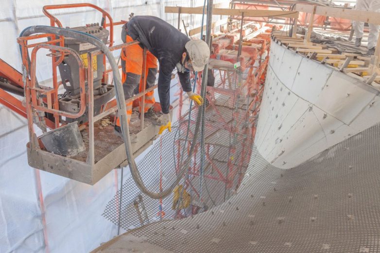 Zavojna fasada napravljena je od betona koji je na licu mesta izlivan preko mreže od ugljeničnih vlakana.