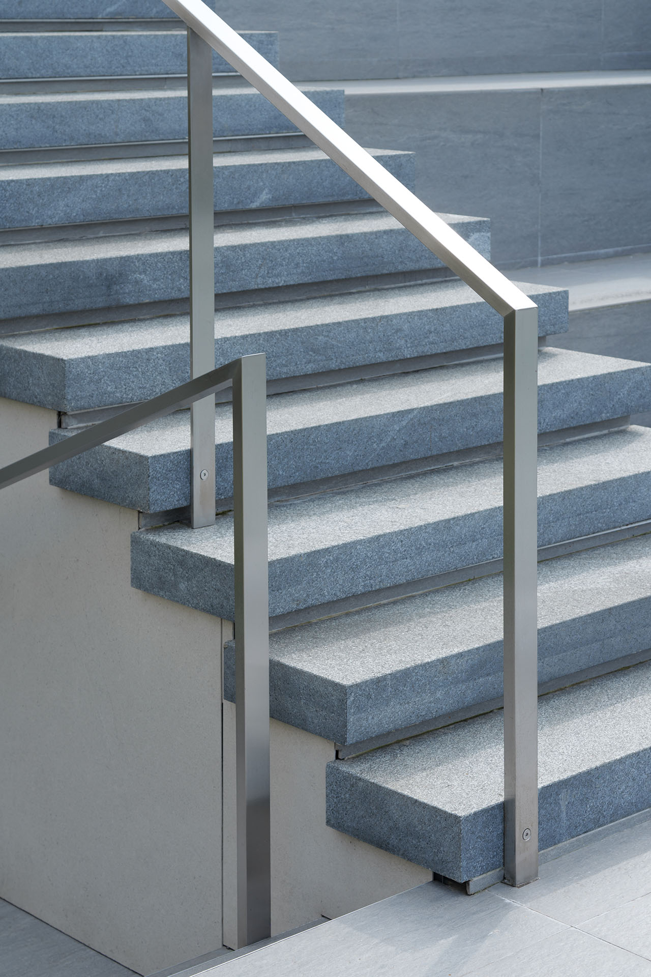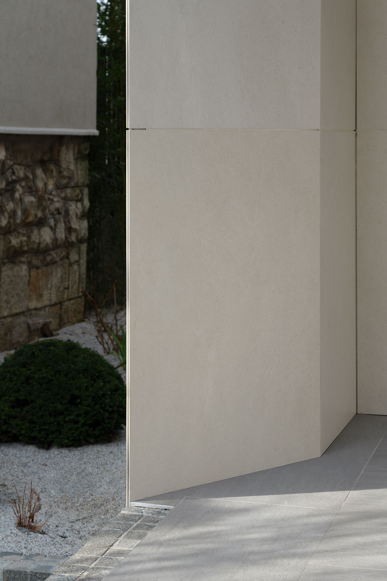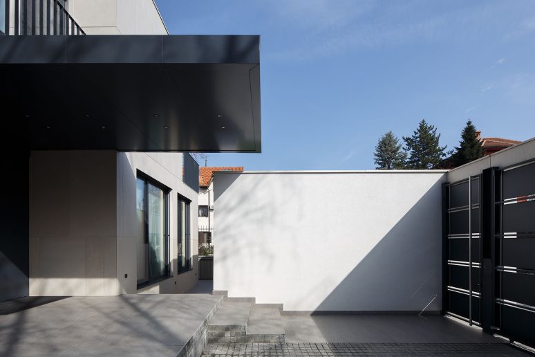 Ulazni portal kao i garaža za tri vozila su pozicionirani u prednjem delu parcele, dok je objekat u neposrednoj pratnji. Relativno malo dvorište je organizovano kao zatravljena površina sa plažom bazena i par kaskadnih žardinjera prema sadržajima suterena.