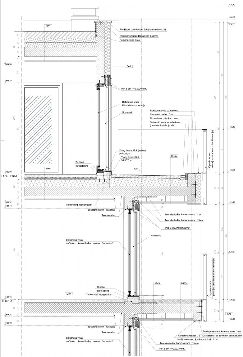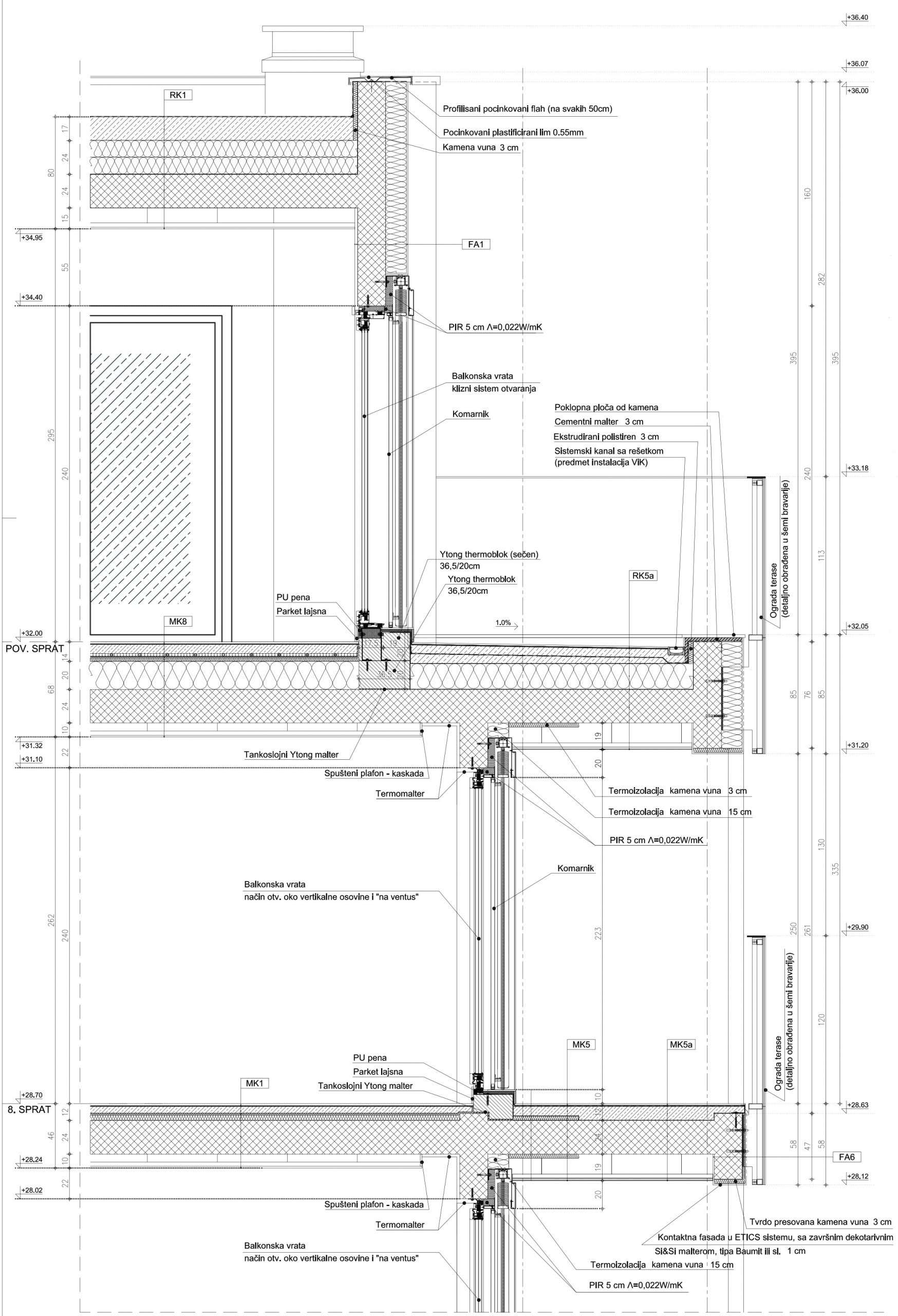 Što se tiče materijalizacije fasade, primenjeni su kontaktna fasada (Roefix) i metalni perforirani paneli.