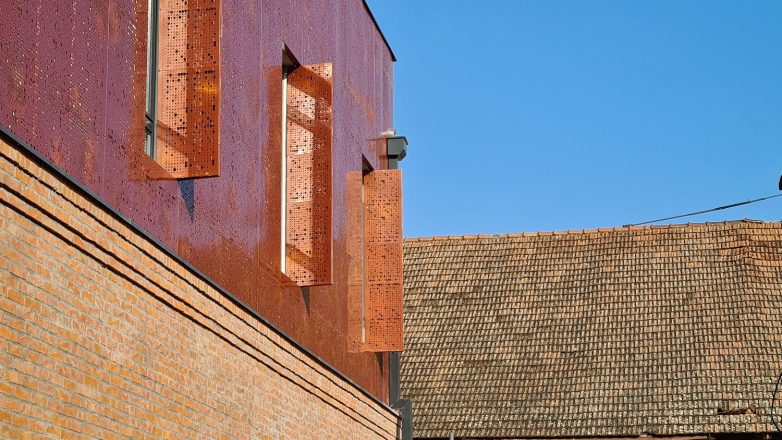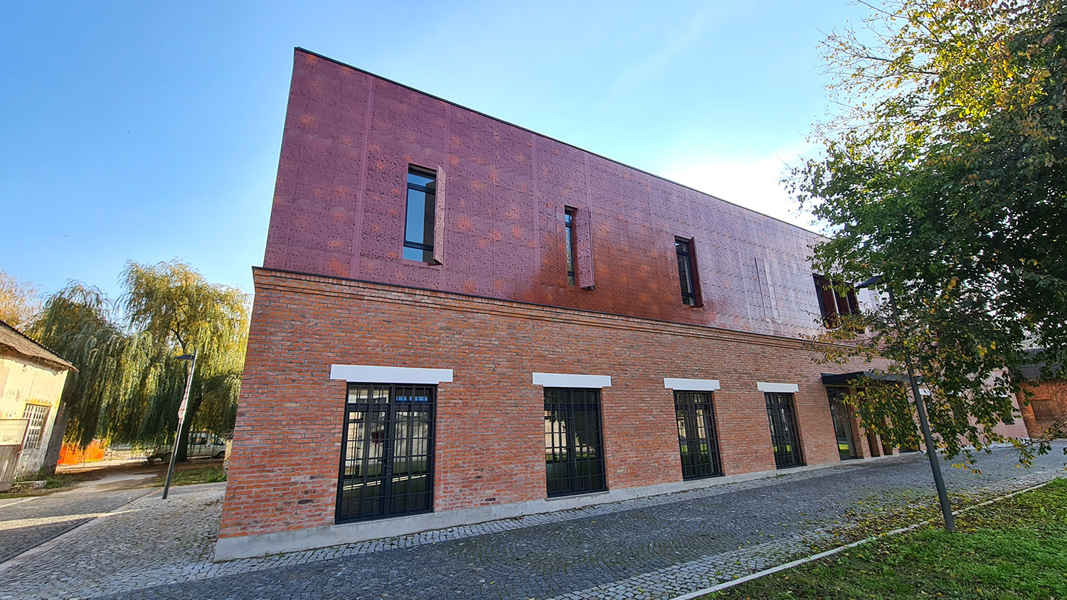 Originalna opeka sa naglašenim nadprozorskim gredama u prizemlju je zadržana, dok je objekat nadgrađen primenom drugog materijala, odnosno okačena je pikselasto perforirana aluminijumska fasada koja ima boju rđe dok su na krov postavljeni solarni paneli.