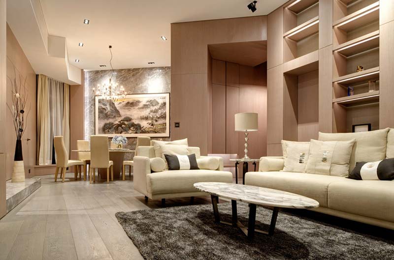 Tako je kineski studio In Hims iskoristio drvo i mermer kao obloge na zidovima dok je celokupni tapacirani nameštaj u bež tonovima. Crni detalji, kao što je niša za TV ili niše u plafonu, u koje su smeštene svetiljke, ističu se u ovom svetlom prostoru.