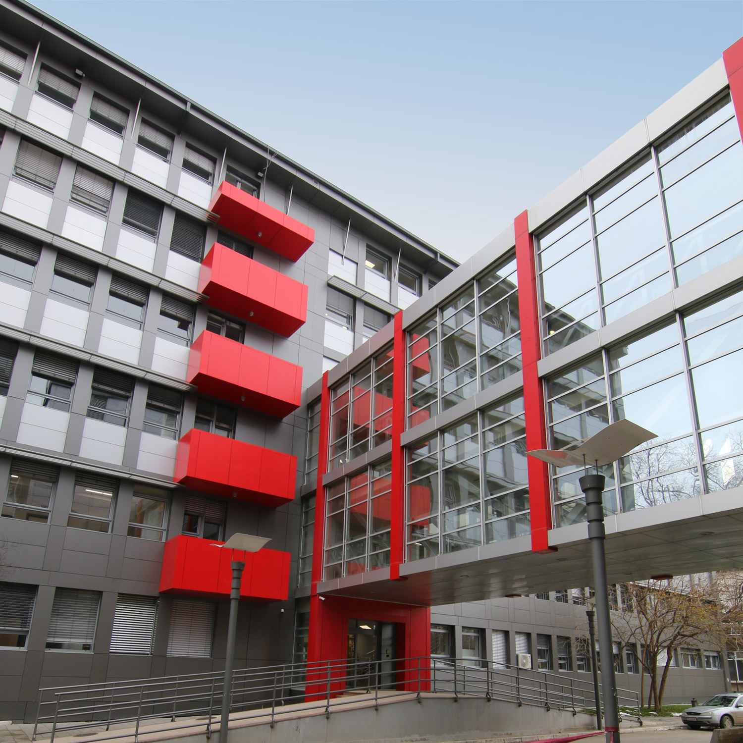 Za fasadu je izabran Alubond kako bi se zgrada što bolje uklopila sa Urgentnim centrom sa kojim je povezana pasarelom.