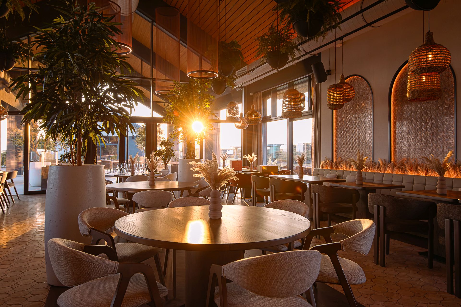 U enterijeru restorana ključni motiv je visina od oko sedam metara. Prostor organizuju centralno postavljeni šank-bar i retro pult koji vizuelno „levitira” duž zadnje zone sale i formira jasnu servisnu osovinu.
