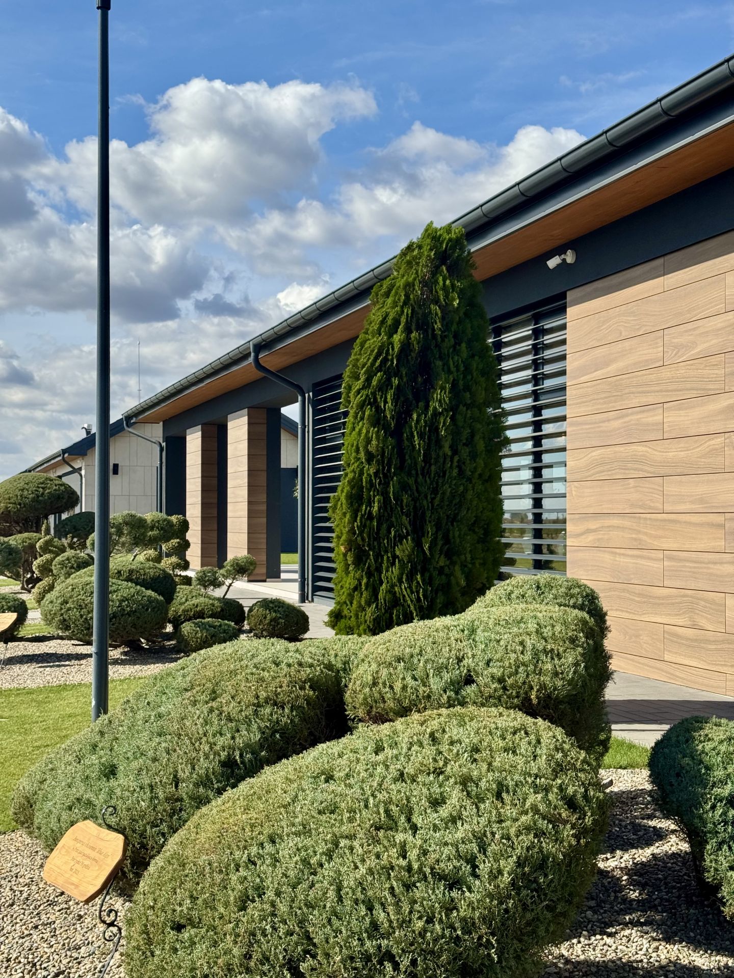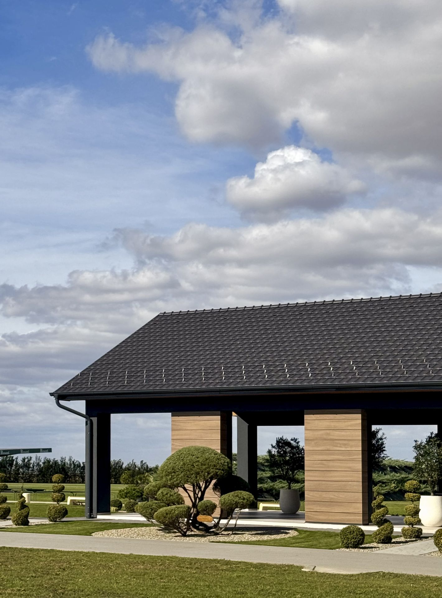Arhitektura počiva na jednostavnim volumenima i prirodnim materijalima, sa naglašenim odnosom prema ravničarskom pejzažu. U eksterijeru dominiraju drvene i kamene površine, a pejzažno uređenje koristi zrele zasade koji odmah formiraju jasan ambijent.