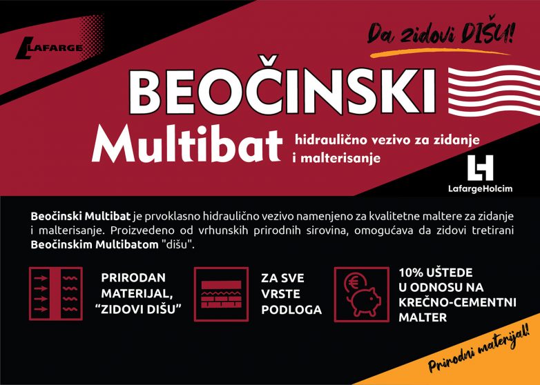 Dugovečni proizvod Lafarge cementare iz Beočina odlikuje se pre svega izuzetnim termoizolacionim svojstvima, zahvaljujući kojima se sprečava formiranje “preseka” u termoizolaciji prilikom zidanja zidova, što je izuzetno važno, naročito ukoliko se radi o gradnji termo blokovima. Prilikom zamešavanja sa peskom u samom malteru se zadržava značajno više vazduha nego pri izradi maltera sa drugim materijalima (kreč i sl), čime se stvara izvanredna izolacija, zbog čega su malteri spravljeni Multibatom otporni i na dejstvo mraza.
