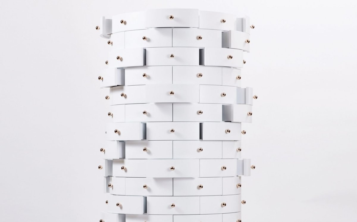 Fioke veličine kutije za nakit zajedno formiraju nesvakidašnju komodu cilindrične forme koja je postavljena na šest zlatnih nogara, dostižući ukupnu visinu od dva metra, piše Dezeen.