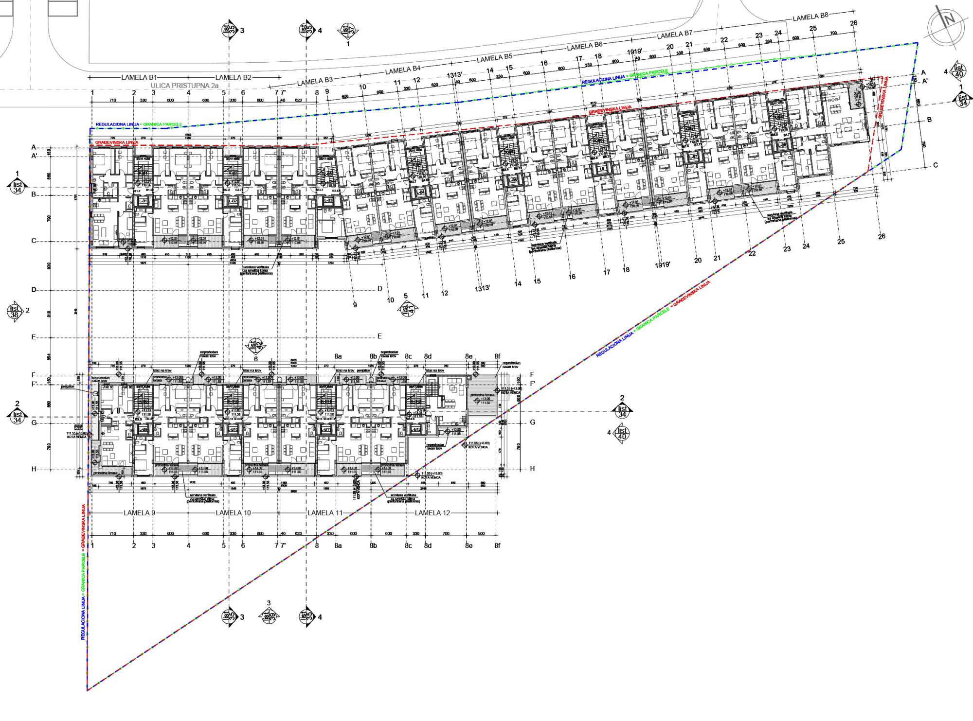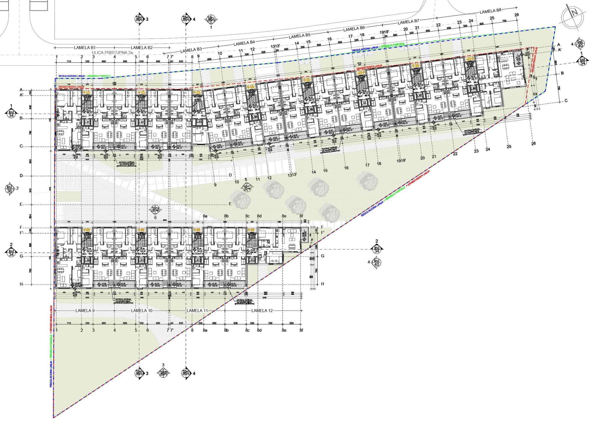 Lamele su po tipologiji jednostrano ili dvostrano uzidane. Kolski pristup omogućen je do Volumena 1 sa ulice Pristupna 2a.