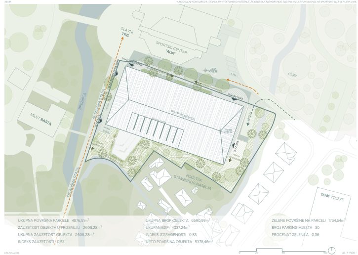 Sa jugozapadne strane, na završetku pešačke trase, pozicioniran je rekreativni ulaz koji preko trga – prostorne kulminacije šetališta – uvodi posetioce u objekat. „Uspostavljanjem ovog ulaza aktivira se postojeća urbana matrica; trg, do sada prostorno nedorečen, postaje svojevrsna uvertira u sportska dešavanja i mesto okupljanja, susreta i zajedničke energije javnog života“, objašnjava žiri.