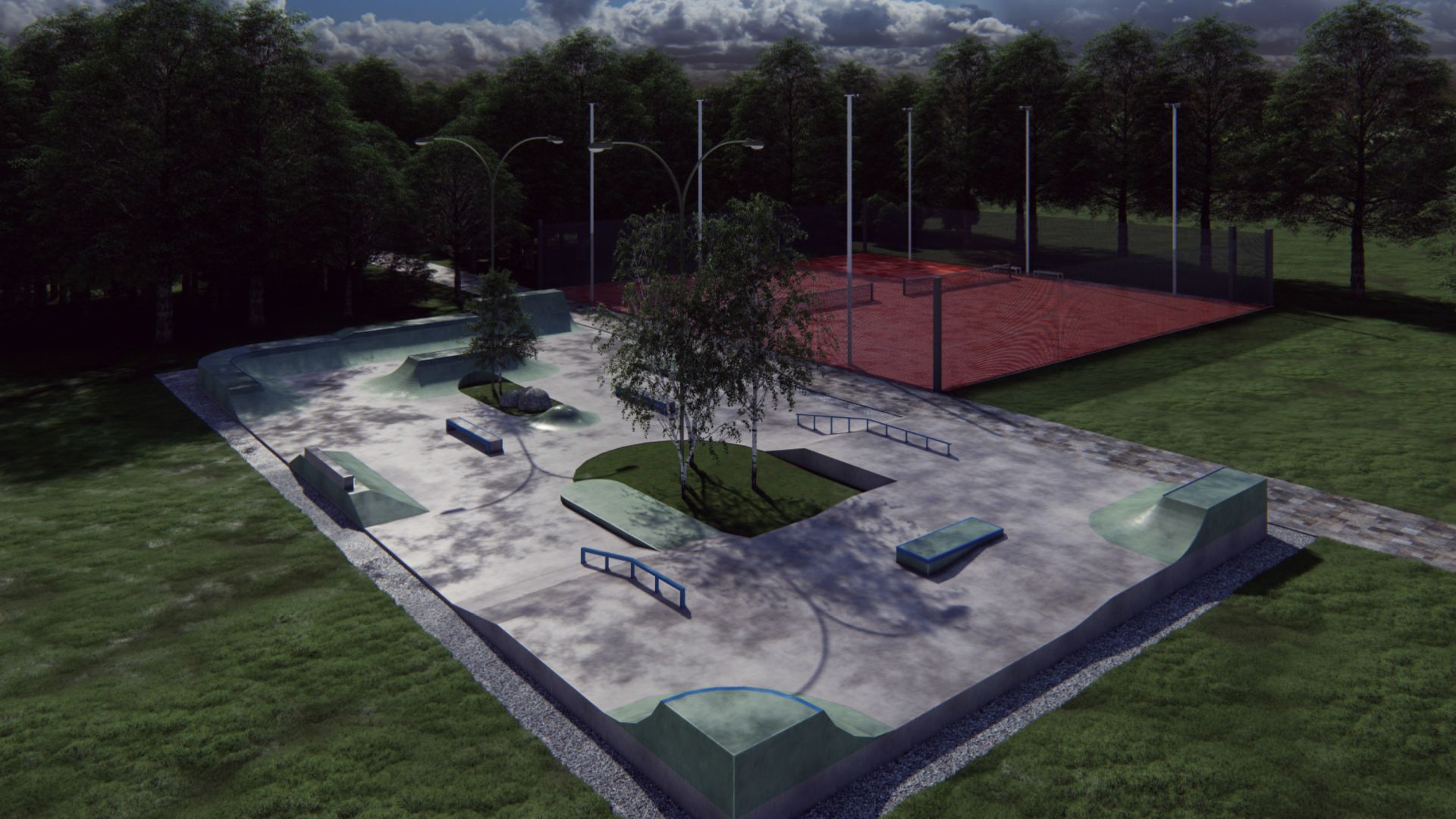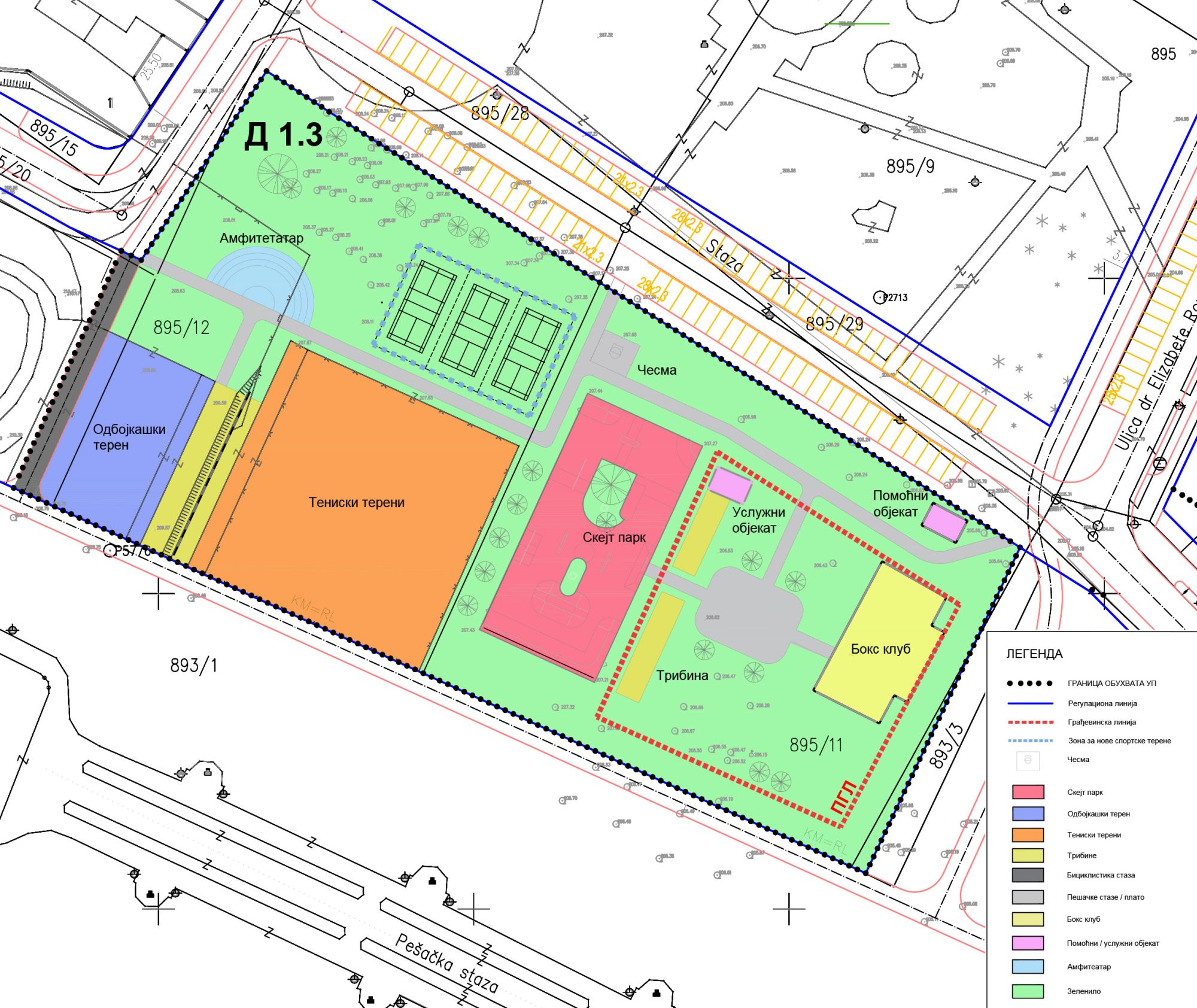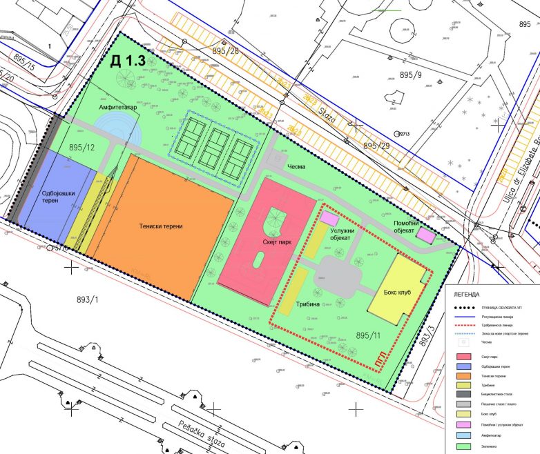 Bez namere da se izlazi iz postojećeg gabarita sportskog terena, planirana je promene namene u skejt park, pri čemu bi sportski teren bio izrađen svojim najvećim delom u koti terena originalne podloge.