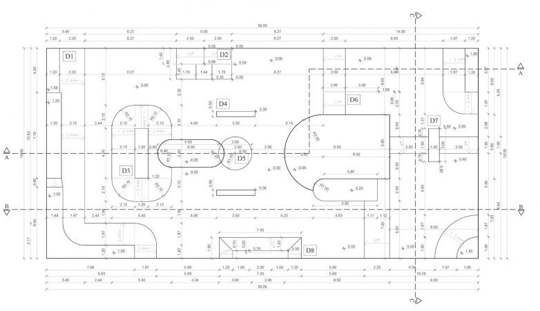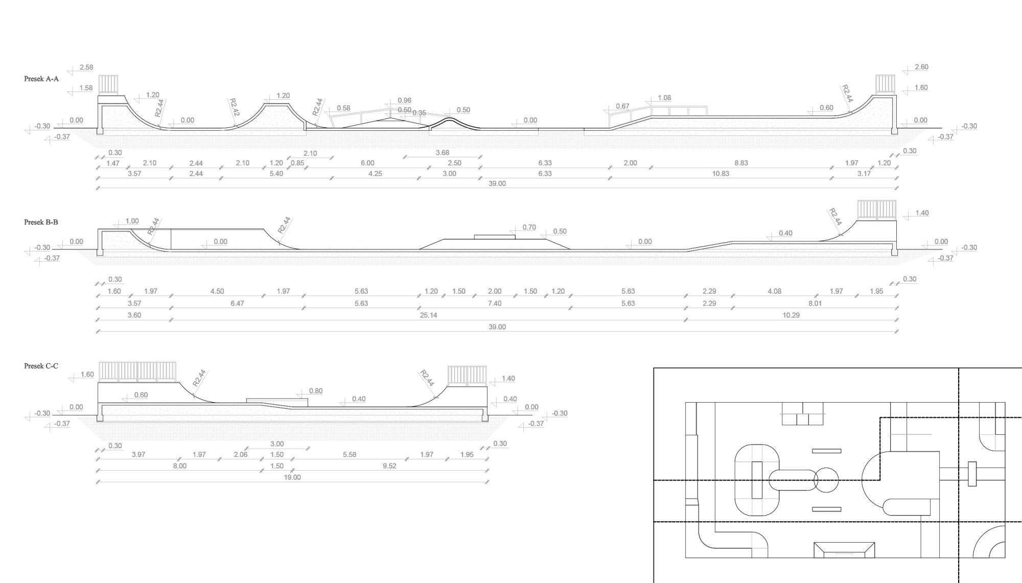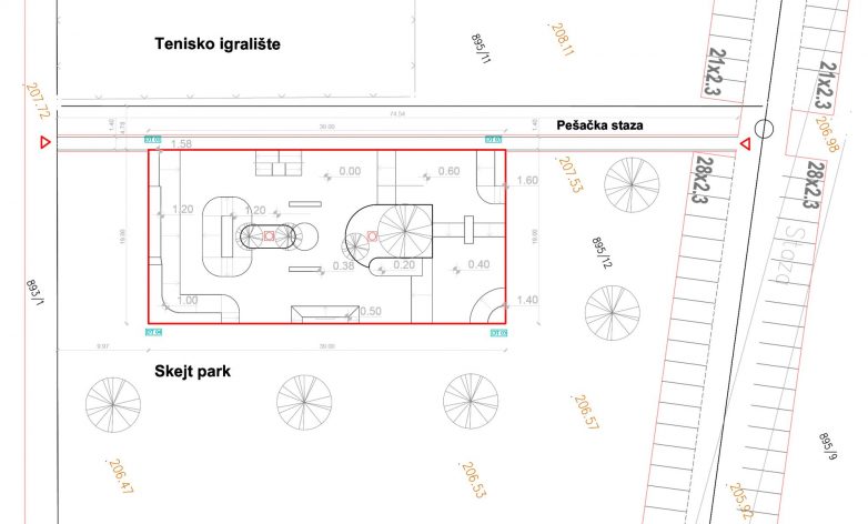 Površina planiranog skejt parka sa korisnom površinom za kretanje iznosi 741 m2. Plato se nalazi u jednostranom padu od 1% prema zelenim površinama.
