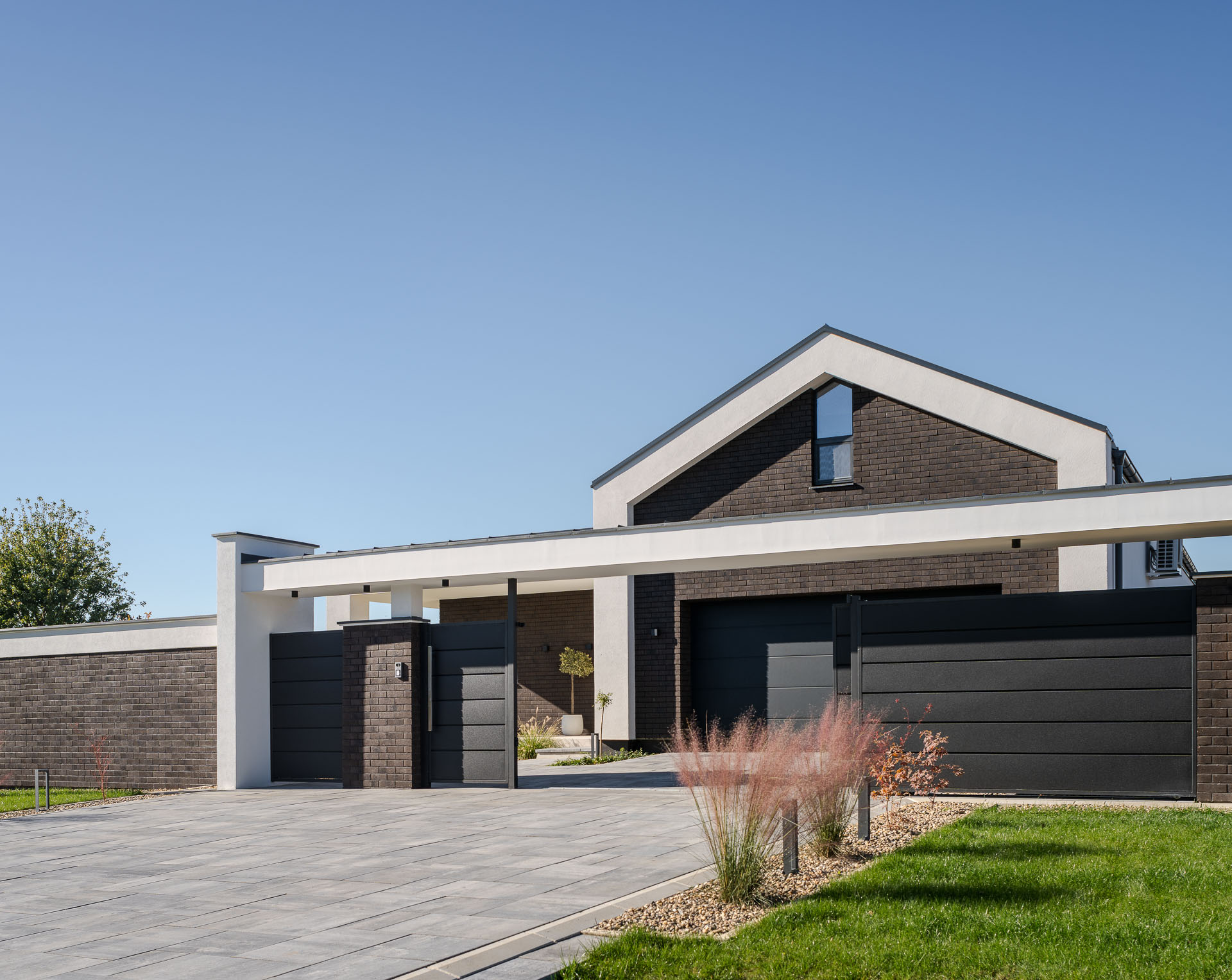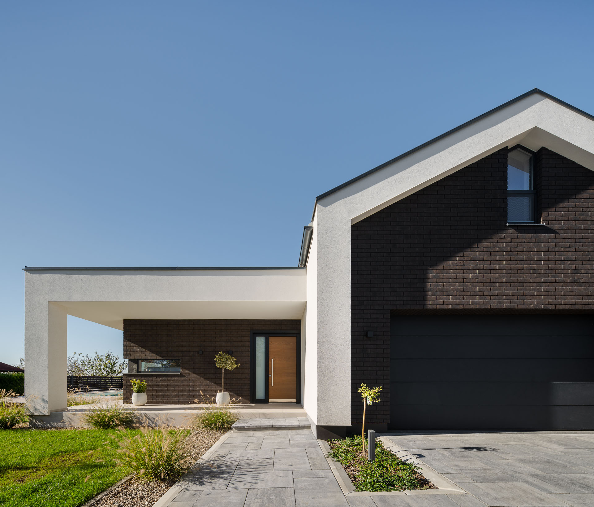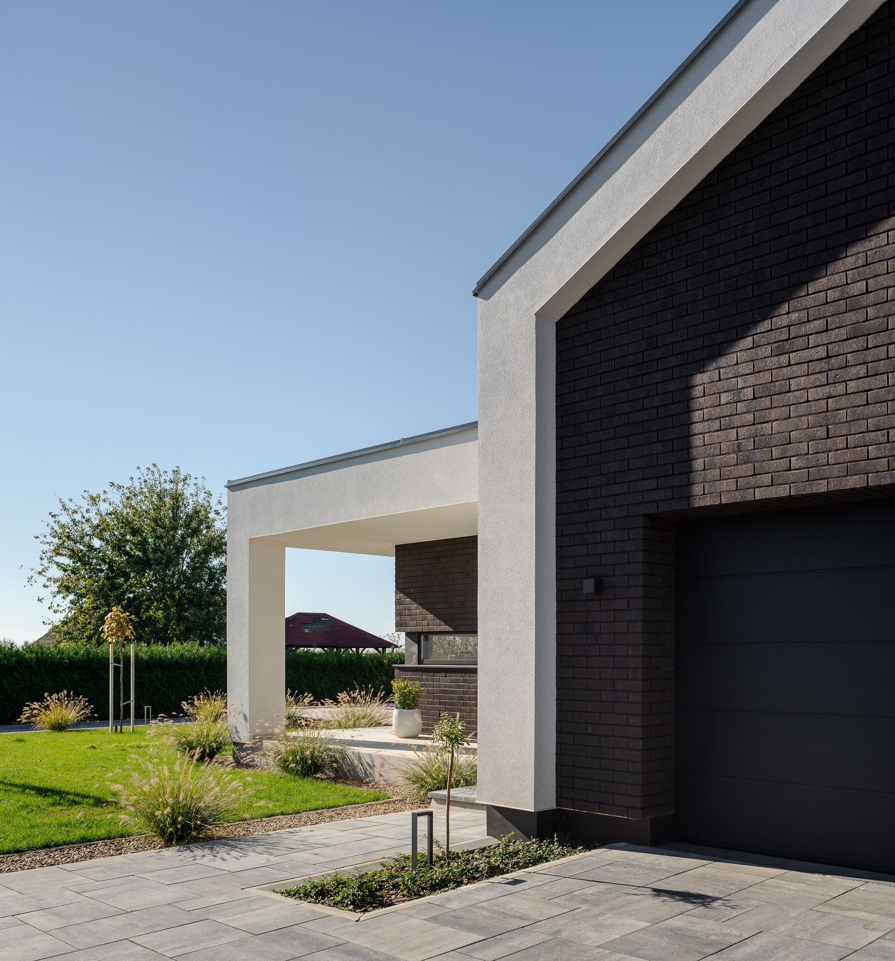 Krovni pokrivač materijalizovan je primenom crepa nove generacije, fasadne opeke itd, dok je fasada spoj belih masivnih i glatkih površina u kombinaciji sa kontrastnim crnim elementima opeke, koji daju duboku teksturu i dodatno naglašavaju oblikovanje kuće.