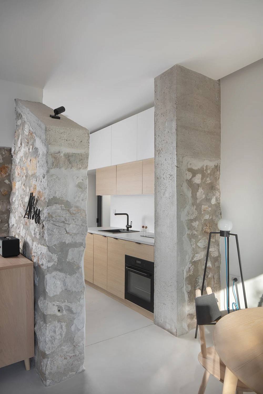 Kameni zidovi su zadržani i nose konstrukciju kako postojeće tako i nove kuće. Dotrajali krovni pokrivač, grede, gipsane zidovi i drvenu neprohodnu strehu bilo je neophodno ukloniti i zameniti novim betonsko-staklenim okvirom.