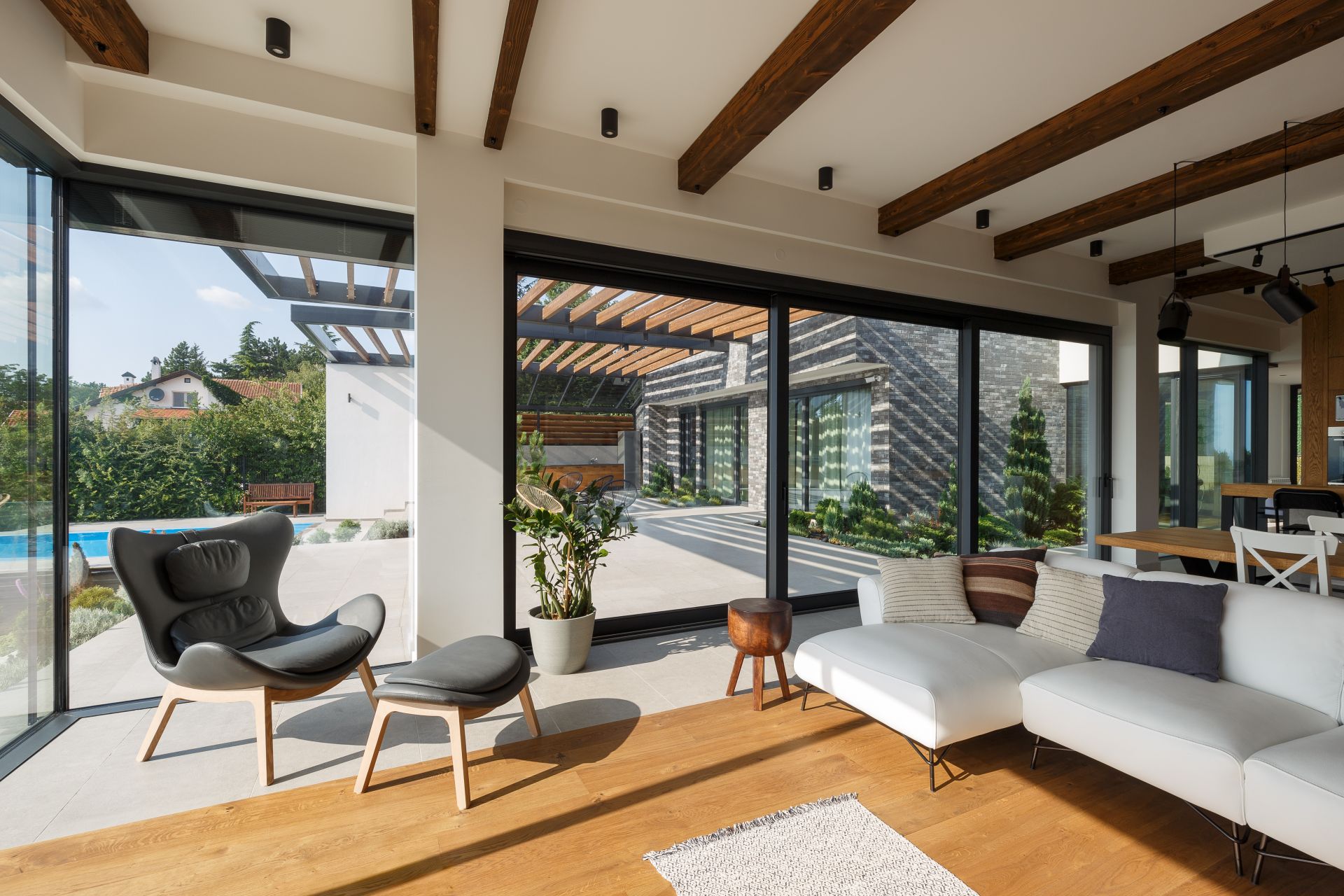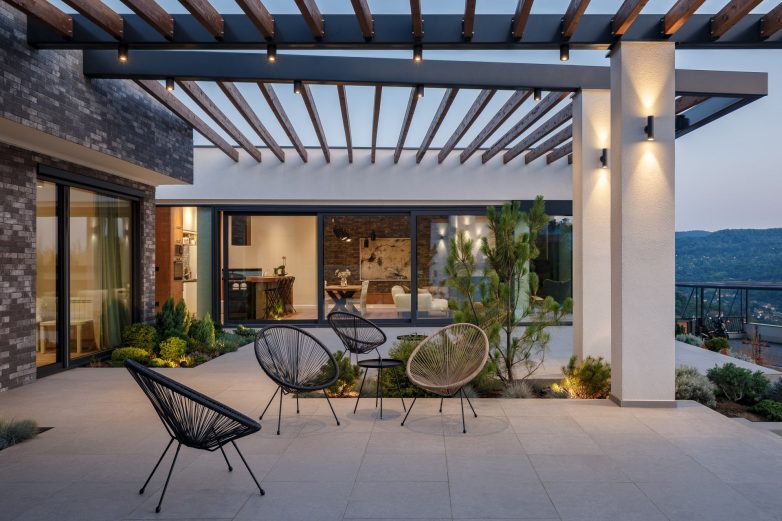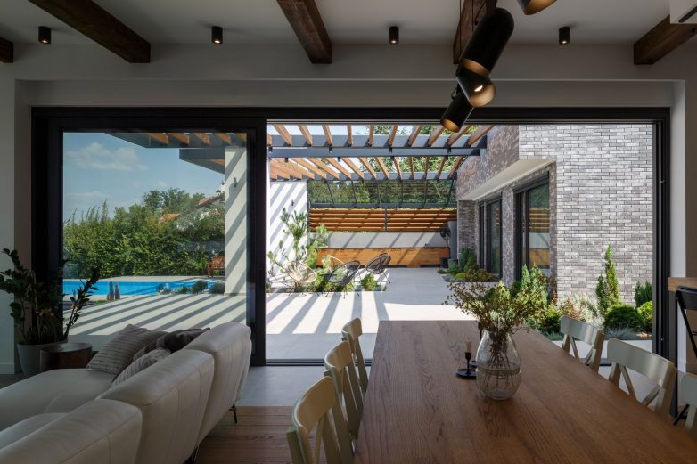 Nadstrešnica terase izvedena je od lameliranih drvenih greda, dok je opremanje enterijera – izbor obloga i rasvete, izbor i dizajn nameštaja, urađeno u saradnji sa novosadskim A1 design hub.