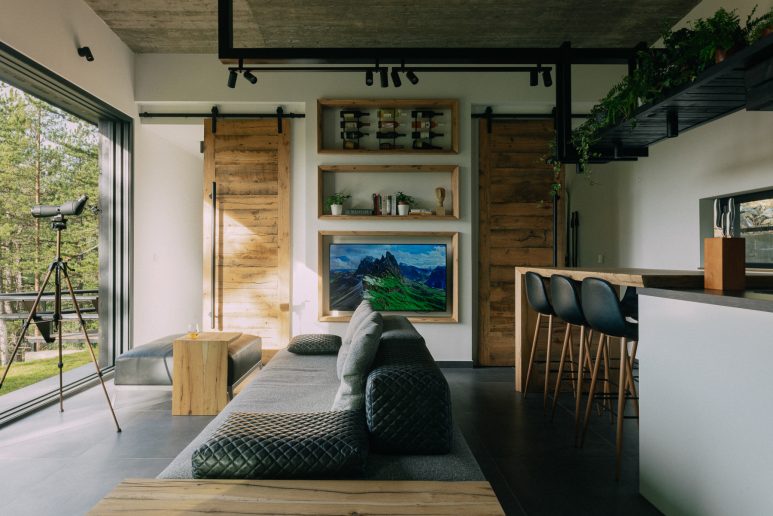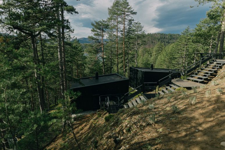 Crni biseri su dva bungalova za dvoje istoričara umetnosti sa crnom fasadom poput borova koji rastu na Zaovinama.