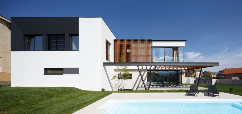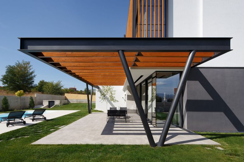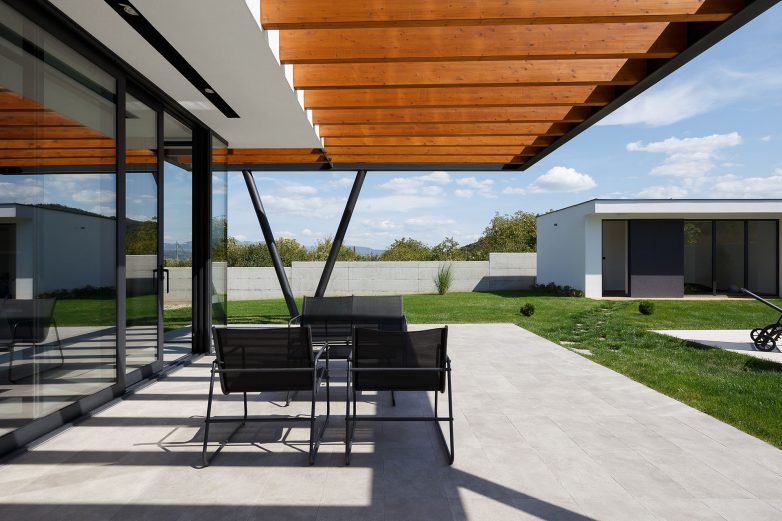 Pergola sa „V“ stubovima pojačava utisak izražene horizontalnosti.