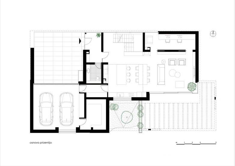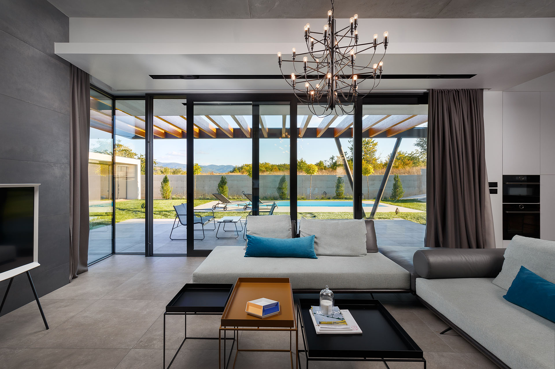 Prizemlje je uređeno kao otvoreni zajednički prostor sa panoramskim pogledom na bazen i krajolik. Velike staklene površine ka dvorištu čine da se dnevni boravak dodatno vizuelno i funkcionalno širi.