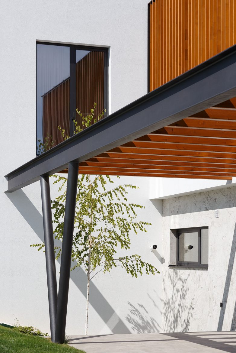 Masivna pergola sa dominantnim čeličnim “V” stubovima i čeličnim nosačima sa LLD gredama pojačavaju utisak izražene horizontalnosti i formiraju niz mikro ambijenata oko objekta. Ove mikro celine u letnjim mesecima postaju sastavni deo dnevnog boravka.