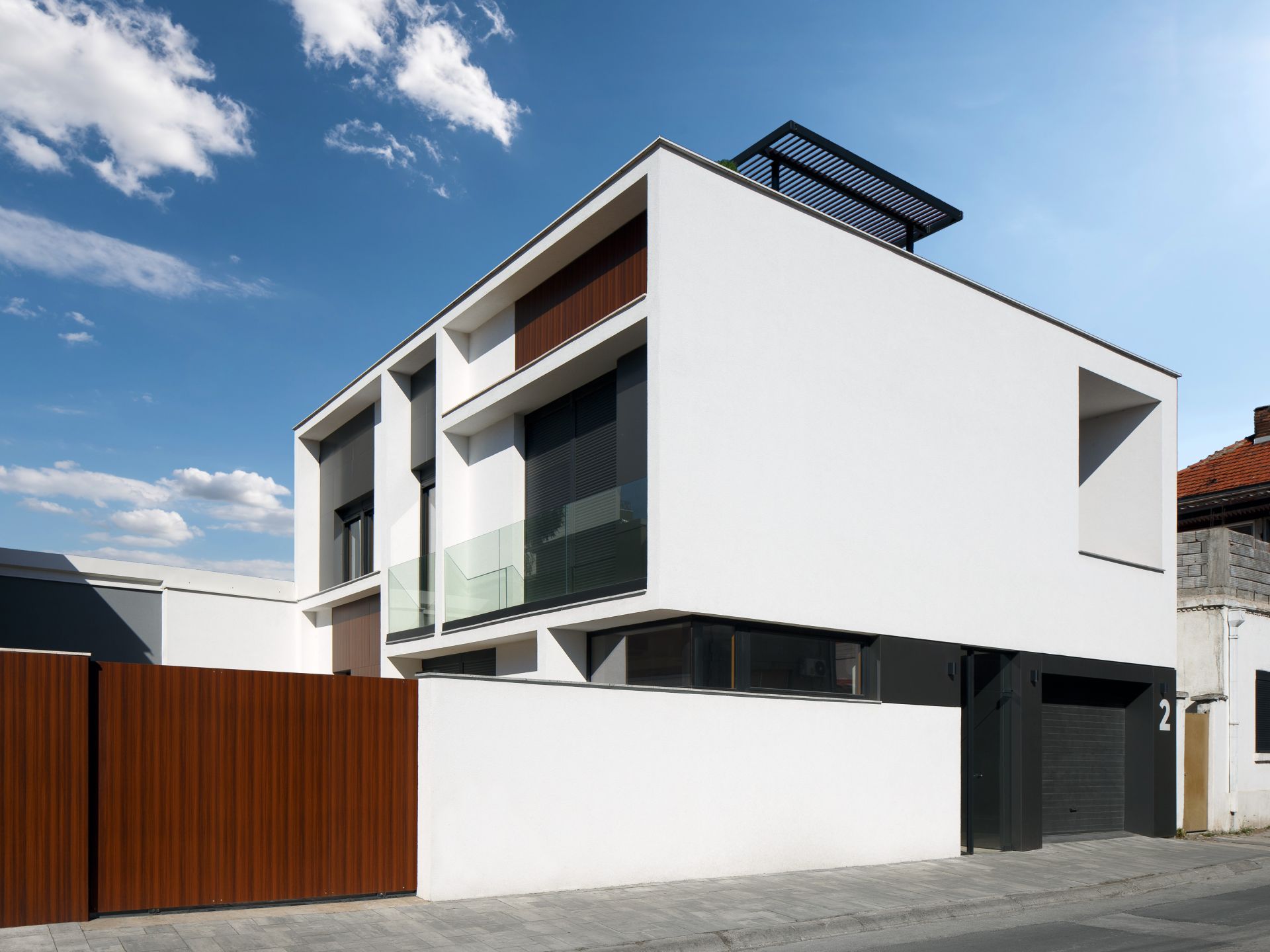 Kuća čiste kubične forme i minimalističkih fasadnih ravni rezultat je klijentove želje da se izoluje od gradske ulične buke i potrebe za privatnim otvorenim prostorom.