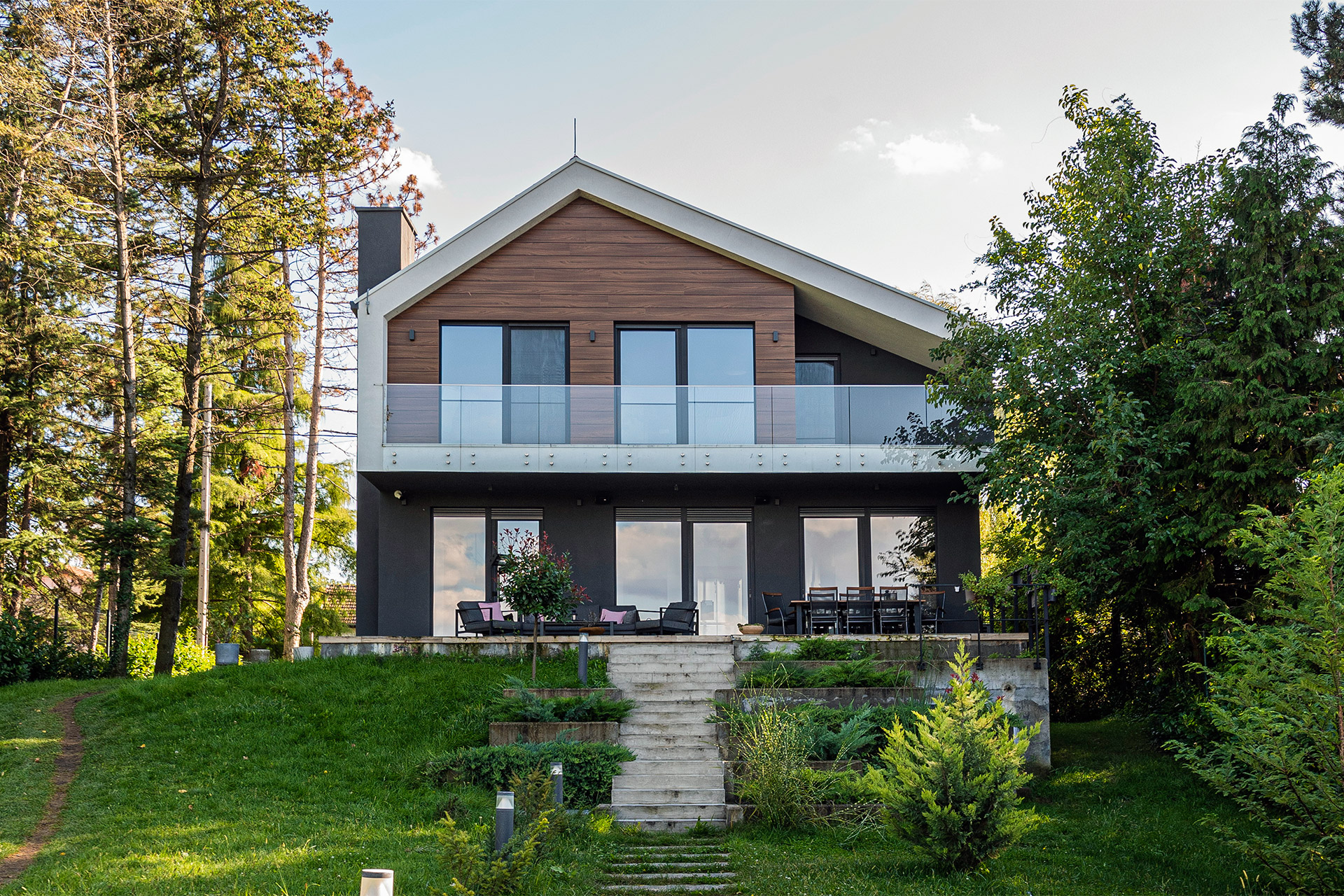 Tako je nastala kuća u kojoj su garaže i ostave sakrivene u suterenu, dok su dnevni boravak, trpezarija i tri spavaće sobe orijentisani ka Dunavu sa velikim staklenim portalima koji maksimalno iskorišćavaju položaj i pogled.
