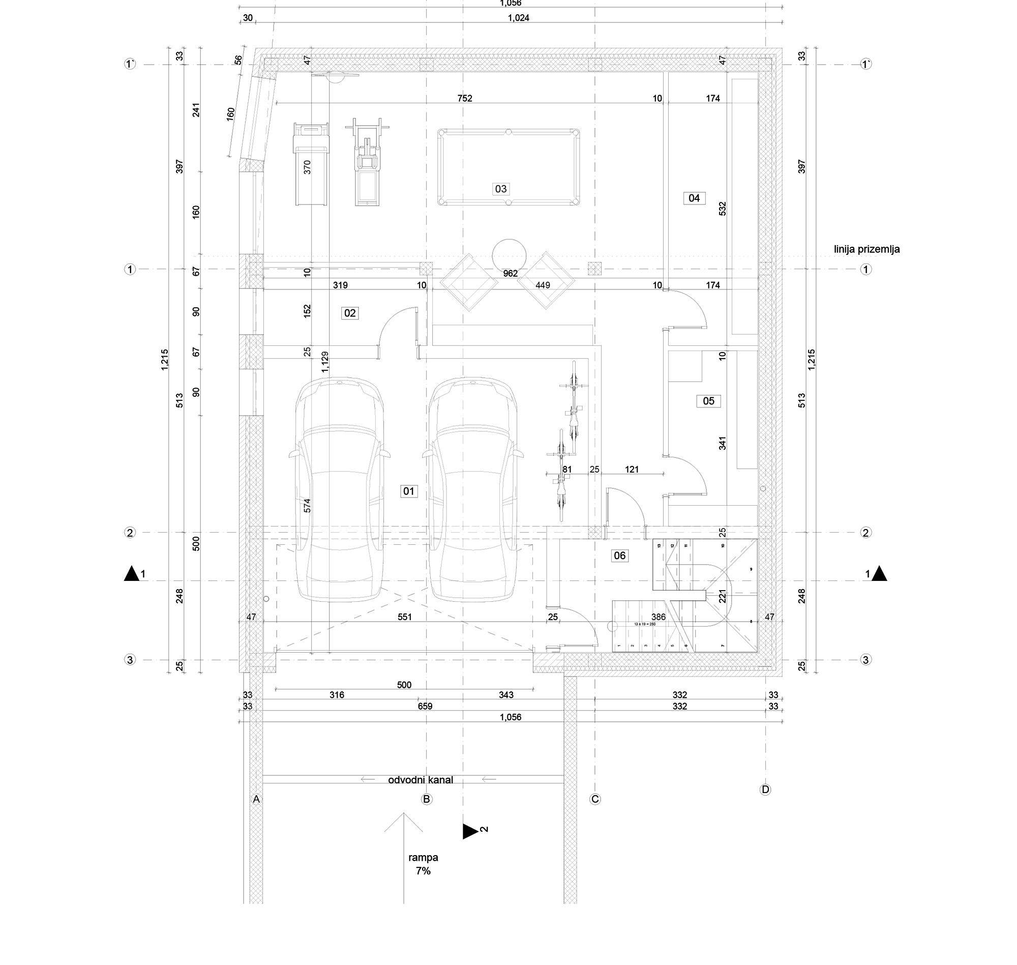 U sklopu objekta u suterenu je mala teretana i garaža za dva automobila. U objekat se ulazi sa frontalne južne strane, a u garažu preko rampe nagiba 12% isto sa južne strane i iz kuće.