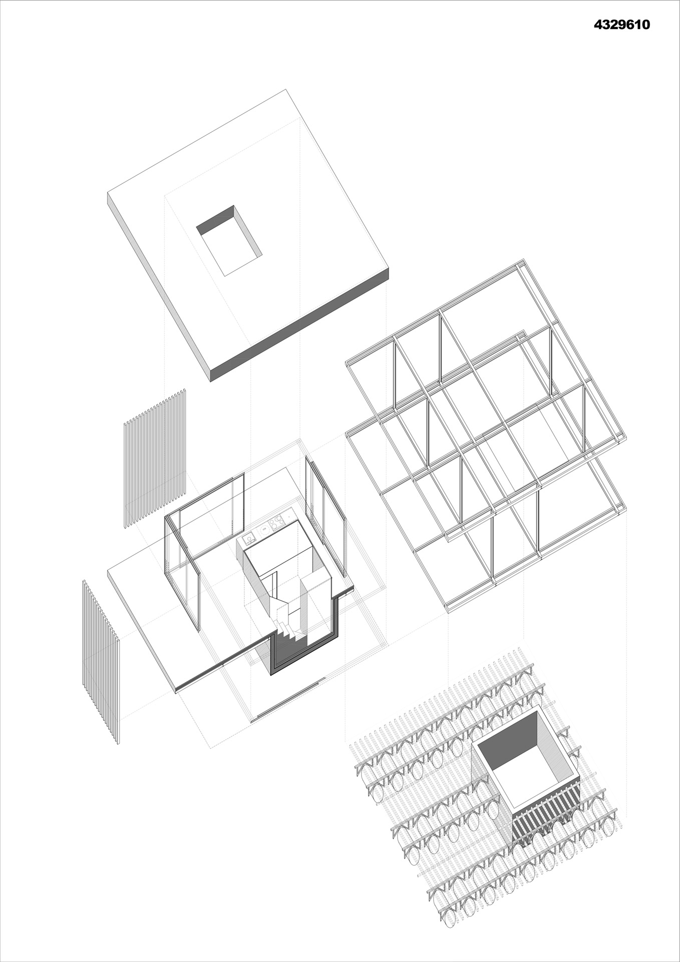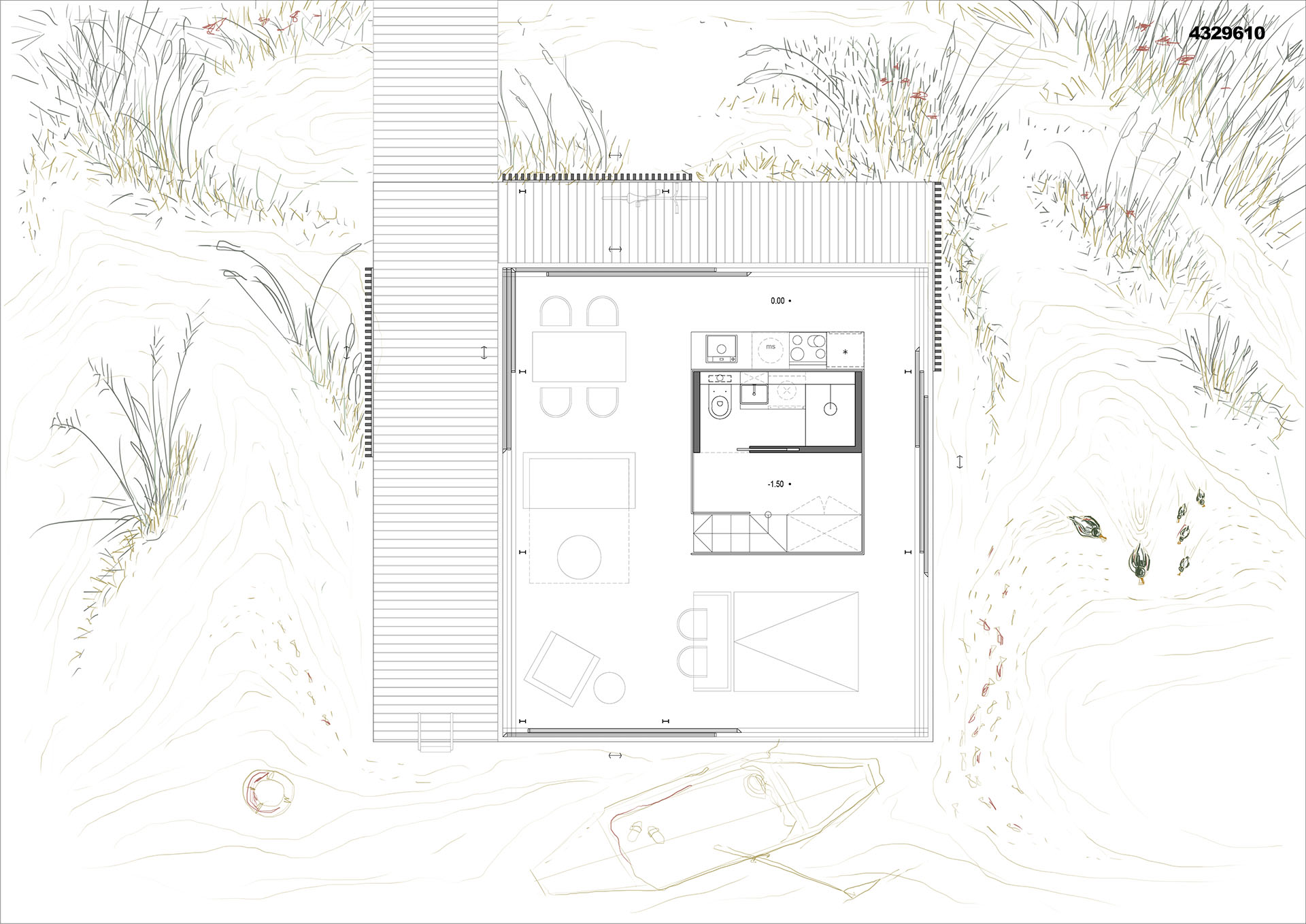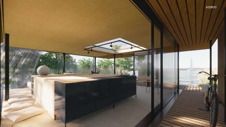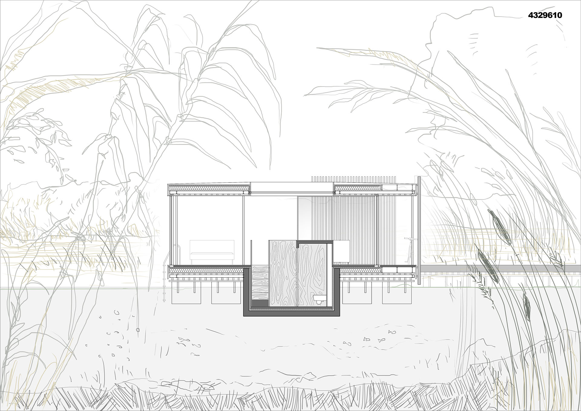 Ovaj sklop na jedan sasvim drugačiji način promišlja poznatu arhitektonsku tipologiju kuće kao splava na vodi. Uvođenje polu-podvodne etaže donosi objektu i karakteristike potpalublja brodova, istovremeno rasterećujući nadvodnu površinu od zatvorenih masa.