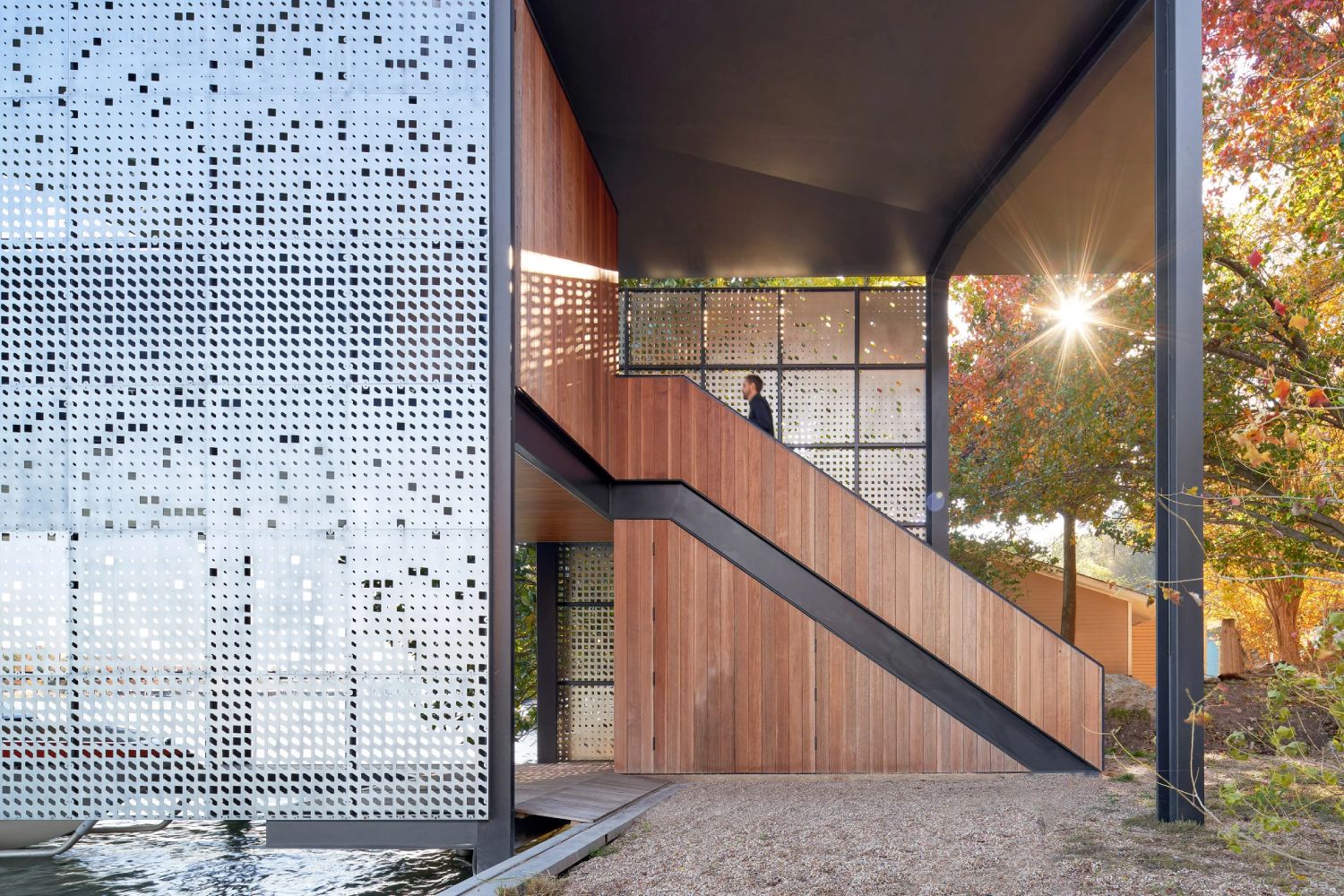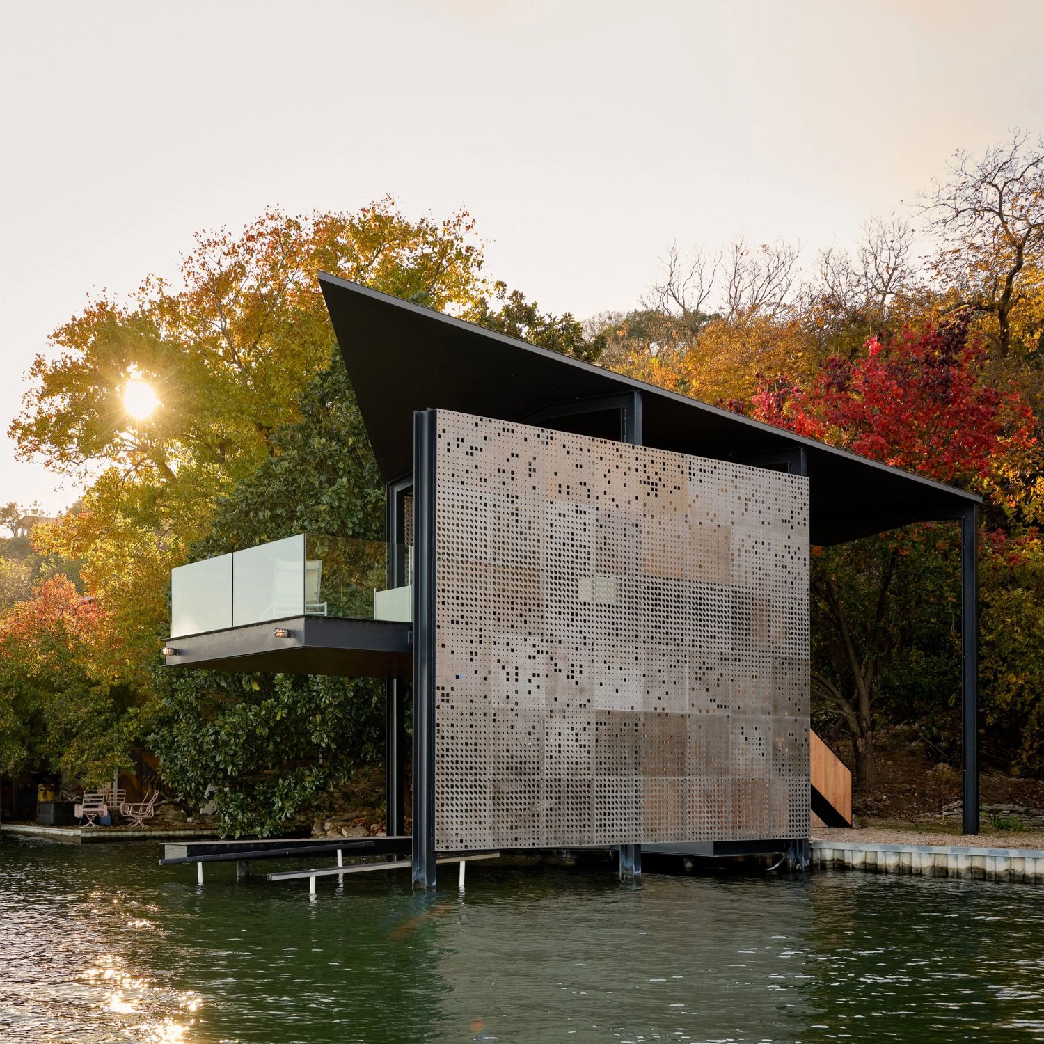 Arhitektonski studio Matt Fajkus Architecture iz Ostina dizajnirao je mali, a istovremeno veoma zanimljiv objekat, čija perforirana metalna fasada osim što doprinosi estetici, omogućava i balans svetlosti i senke tokom cele godine. Filtered Frame Dock je dvoetažni objekat za čamce ali i za relaksaciju korisnika, a izgrađen je u neposrednoj blizini stambene kuće, piše Dezeen.