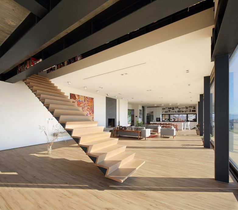 Kontiunitet prekidaju jedino stepenice od čelika sa drvenim gazištima koje vode na gornju etažu i posebno su oblikovane kao težište kompozicije.
