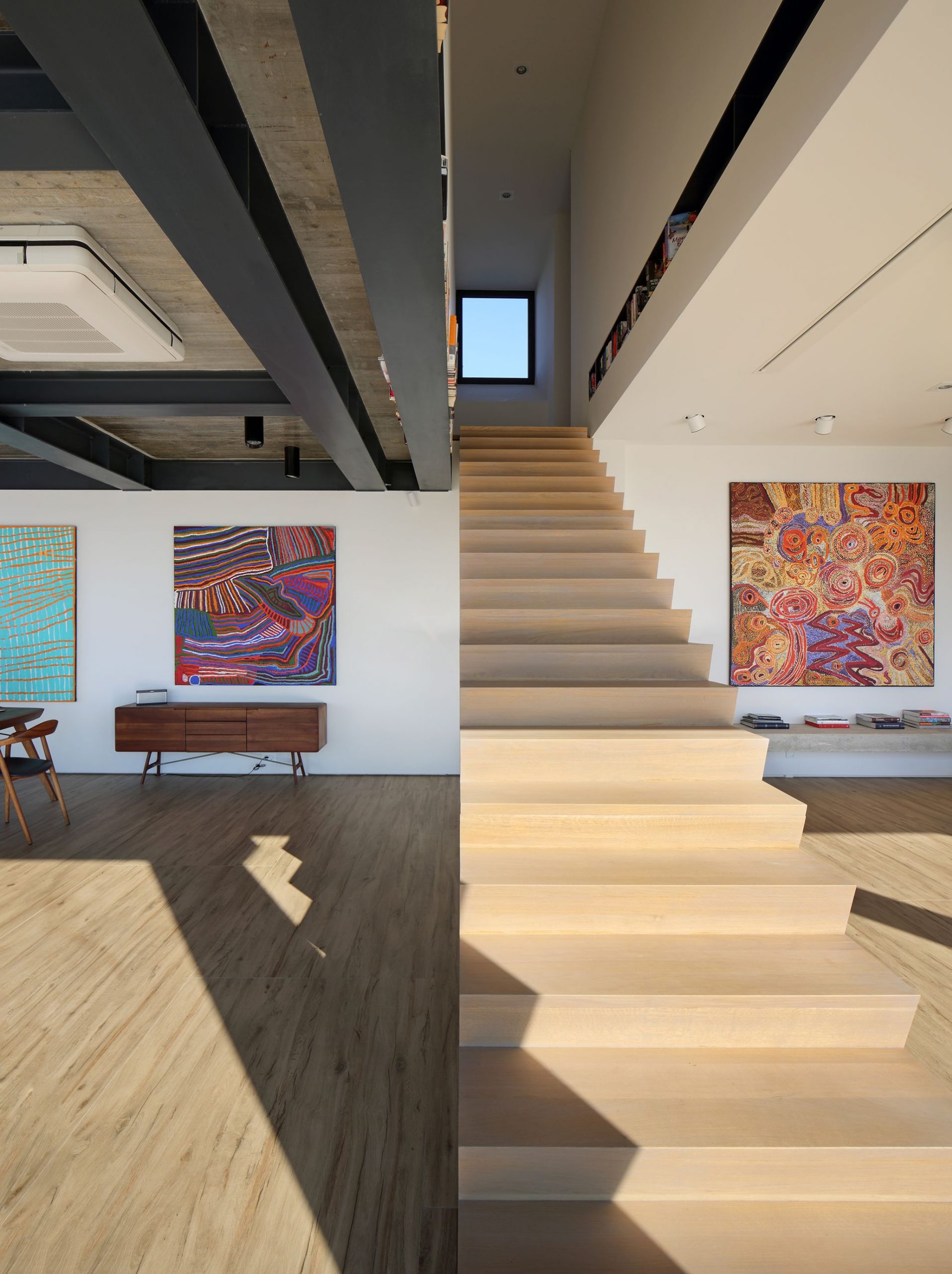 Kontiunitet prekidaju jedino stepenice od čelika sa drvenim gazištima koje vode na gornju etažu i posebno su oblikovane kao težište kompozicije.