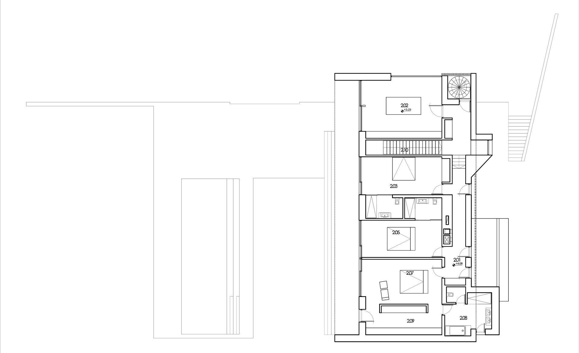 Iz dnevne zone kuće niz nekoliko stepenika silazi se na veliku popločanu terasu sa bazenom i mediteranski vrt. Kao i u prizemlju, sve prostorije na prvom spratu imaju orijentaciju prema gradu, a atelje dodatno i prema šumi.