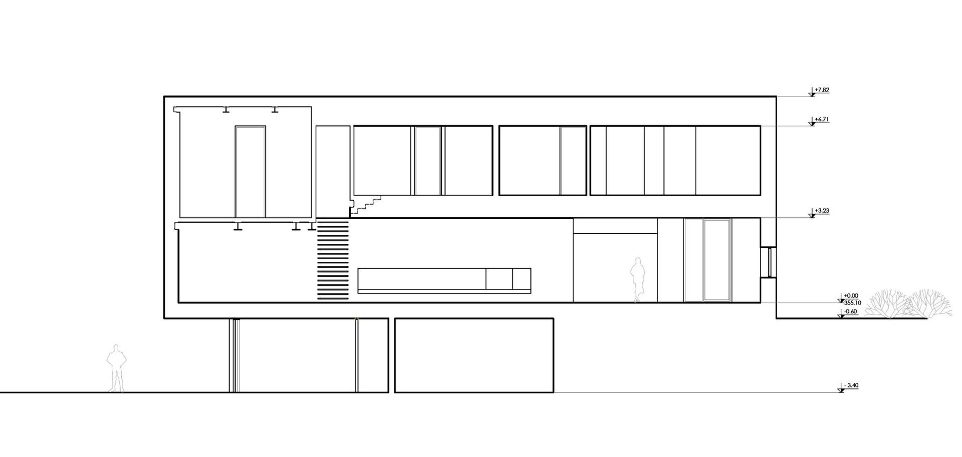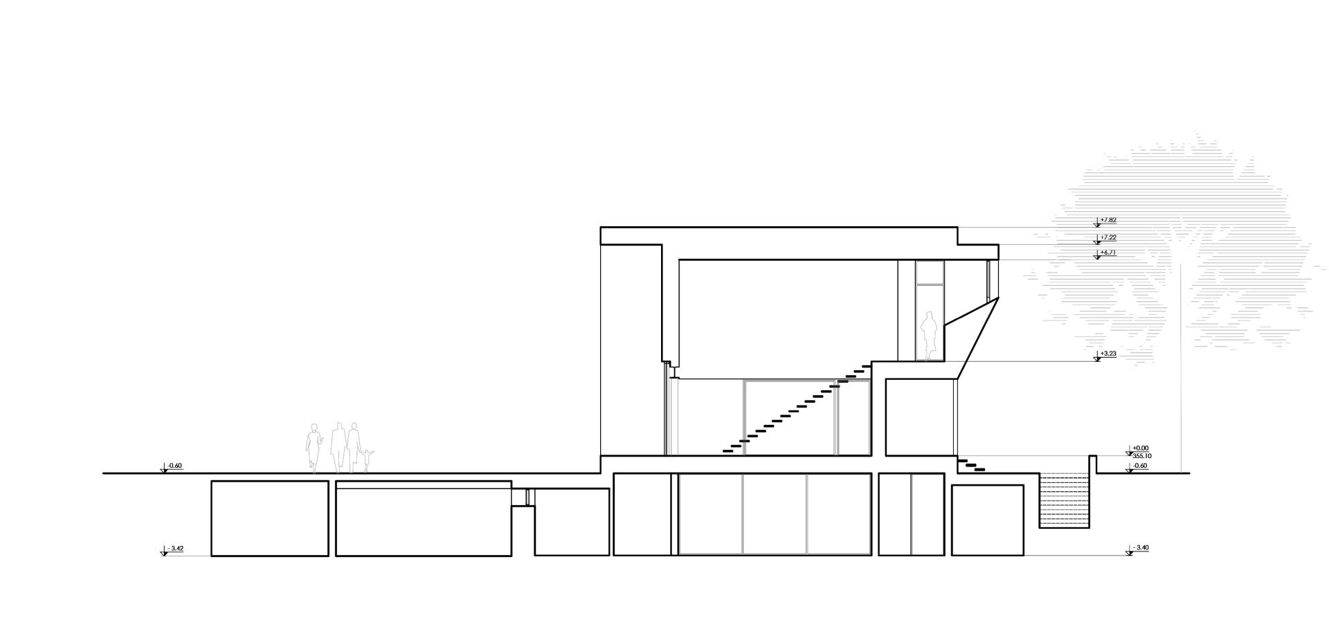 Funkcionalna organizacija objekta od 840 m2 izvedena je kroz tri nivoa, prilagođena potrebama korisnika i zahtevima relativno nagnutnog terena i neposrednog okruženja.