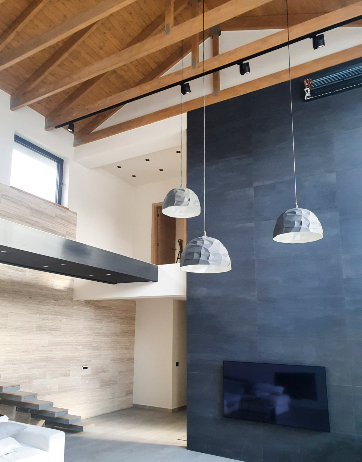 Krovna konstrukcija od lameliranog drveta saglediva je iz unutrašnjeg dnevnog boravka koji je duple visine,