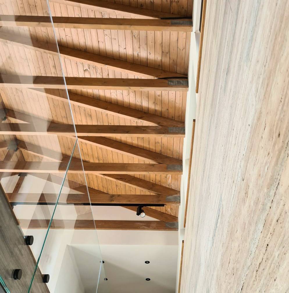 Ono što čini enterijer još atraktivnijim jeste krovna konstrukcija od lameliranog drveta saglediva je iz unutrašnjeg dnevnog boravka koji je duple visine, a drvo kao deo enterijera daje specifičnu kolornu dimenziju unutrašnjem prostoru.