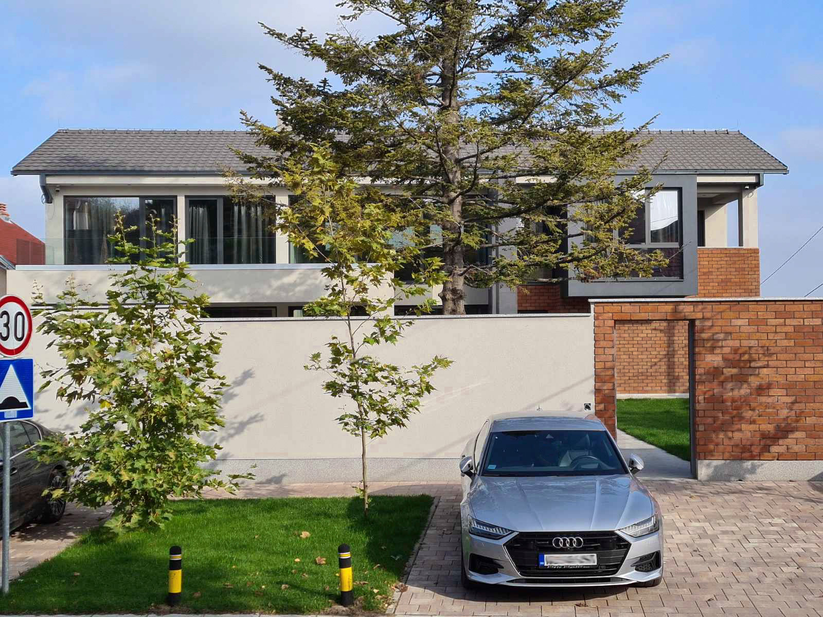 Na delu kuće korišćena je i fasadna opeka koja kao detalj naglašava oblikovne elemente kuće. Staklo na ogradama, tako i na velikim površinama otvora jos više naglašava estetski pristup odabiru materijala.