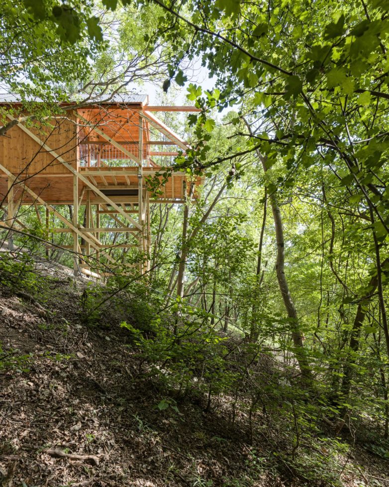 Na izrazito strmom terenu, okružena mladim stablima hrastovog i bagremovog drveta izgrađena je kućica za odmor od 30 metara kvadratnih, čija je glavna karakteristika tačkasto oslanjanje, odakle i sam naziv projekta.