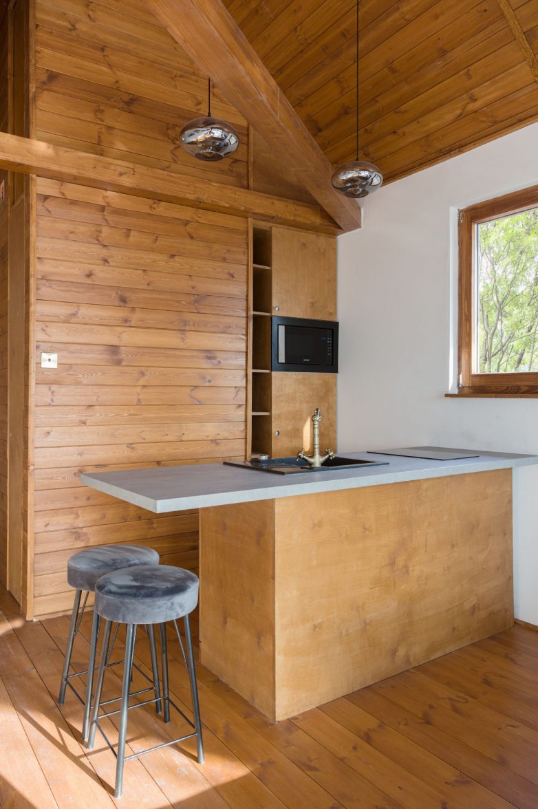 A kada se stupi u kuću, goste dočekuje skladni enterijer u kojem ništa nije pretenciozno već se sve nalazi na svom mestu i napravljeno je od materijala koji dolikuju jednom domu u šumi.