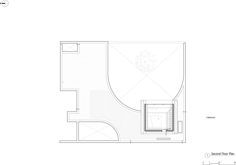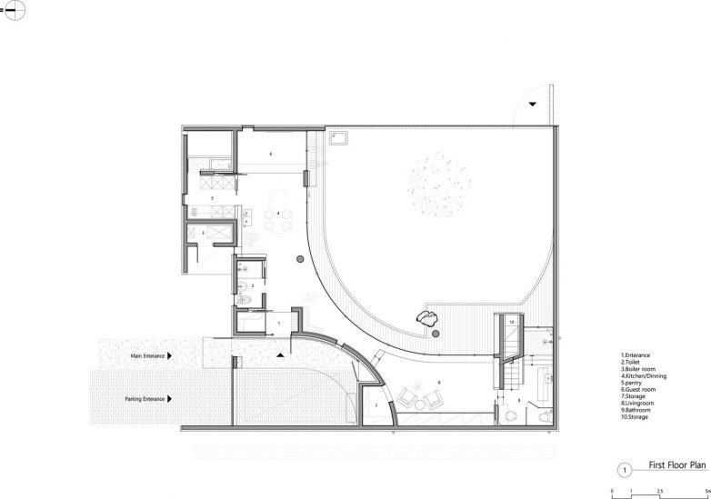 Svi prostori na prizemlju imaju organsku formu i u potpunosti su otvoreni ka dvorištu, tako da dvorište postaje proširenje unutrašnjosti kuće i dnevna svetlost neometano cirkuliše iz otvorenog ka zatvorenom prostoru.
