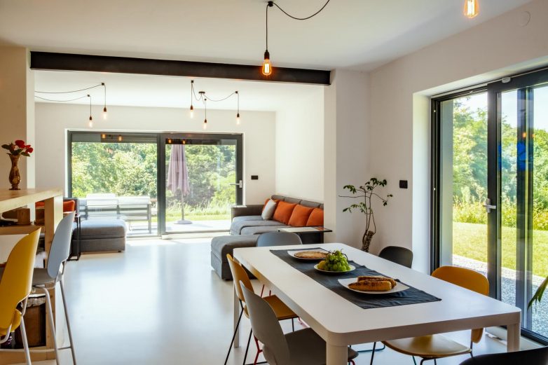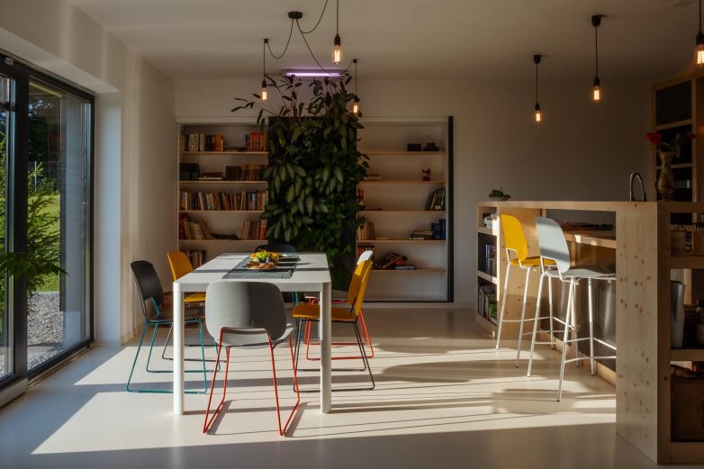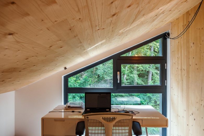 Već na samom ulazu uočavaju se izuzetno vešto prostorno osmišljene poluetaže i etaže, koje su povezane stepeništem. Posebno je zanimljiva i CLT konstrukcija ostavljena vidljivom u enterijeru, gde dolazi do izražaja u kombinaciji s elementima industrijskog dizajna: čelični profili i ograda na stepeništu, liveni pod od epoksi smole bele boje, kamin čiji se dimnjak diže uz stepenište do zadnje etaže, ogoljena rasvetna tela…