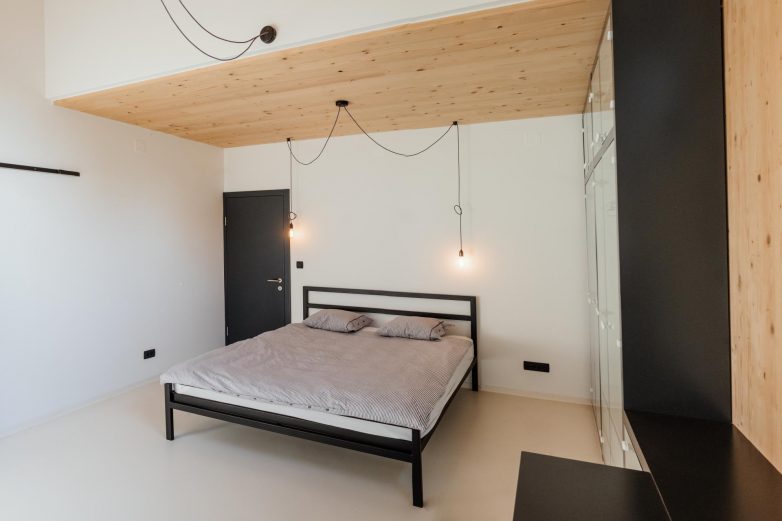 CLT konstrukcija ostavljena je vidljivom gde dolazi do izražaja u kombinaciji s elementima industrijskog dizajna.