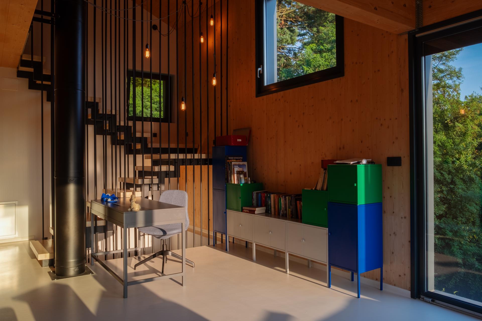 Već na samom ulazu uočavaju se izuzetno vešto prostorno osmišljene poluetaže i etaže, koje su povezane stepeništem. Posebno je zanimljiva i CLT konstrukcija ostavljena vidljivom u enterijeru, gde dolazi do izražaja u kombinaciji s elementima industrijskog dizajna: čelični profili i ograda na stepeništu, liveni pod od epoksi smole bele boje, kamin čiji se dimnjak diže uz stepenište do zadnje etaže, ogoljena rasvetna tela…