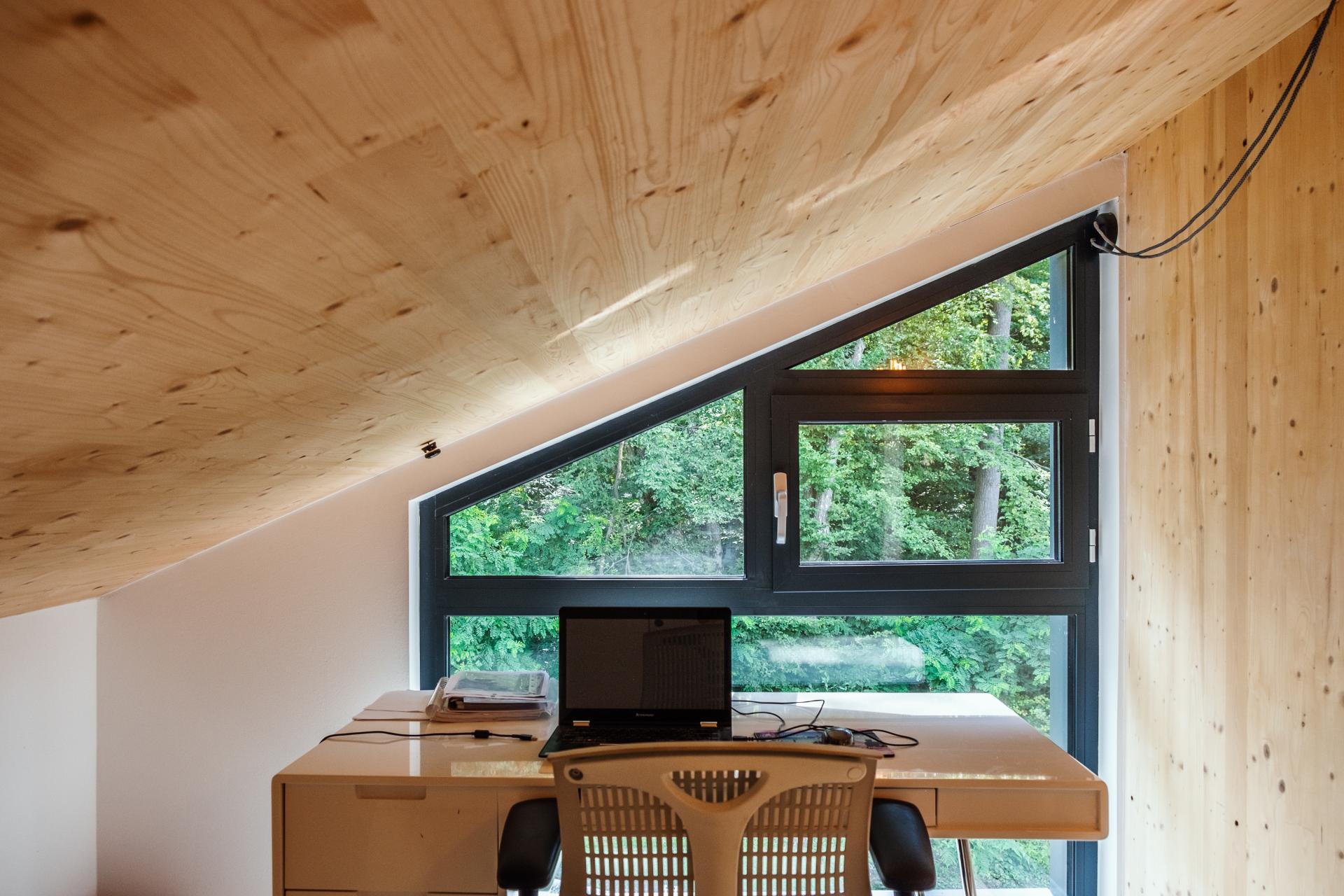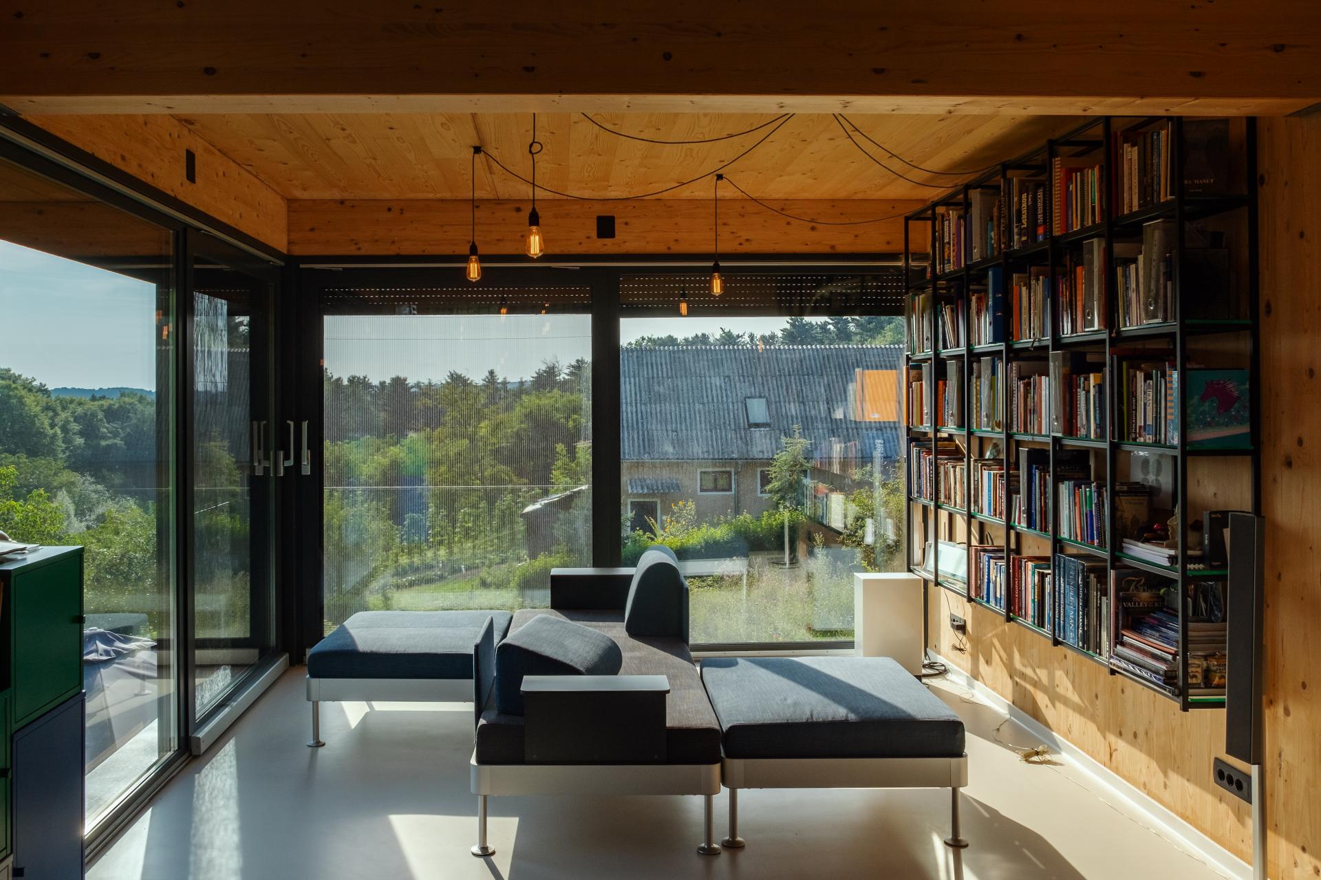 CLT konstrukcija ostavljena je vidljivom gde dolazi do izražaja u kombinaciji s elementima industrijskog dizajna.