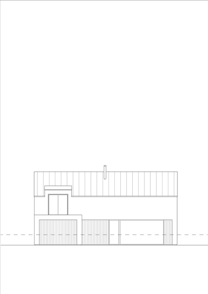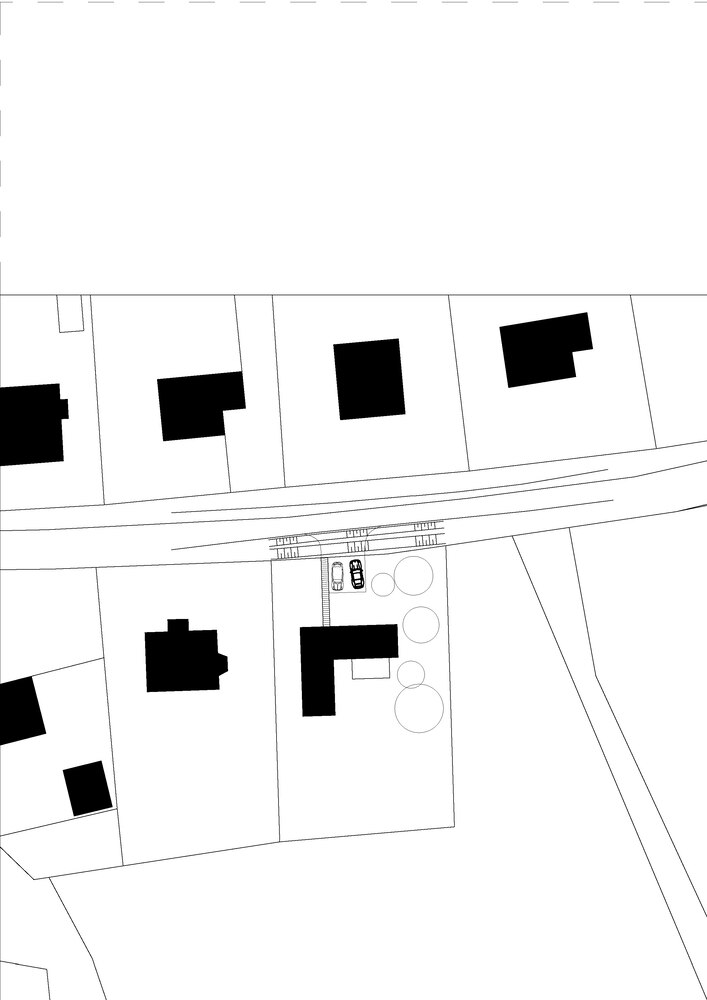 Na ulazu je napravljen parking kako bi se kompenzovala prva visinska razlika parcele i stvorio osećaj privatnosti odvajanjem privatnog dela poluprivatnim prednjim prostorom.