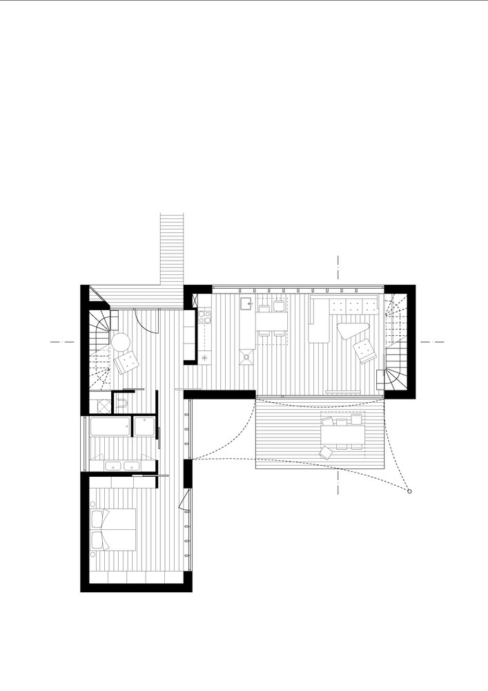 U prizemlju glavnog dela su kuhinja, trpezarija i dnevni boravak, potkrovlje dele foto-atelje i raj za decu, a u krilu je smeštena spavaća soba sa kupatilom.