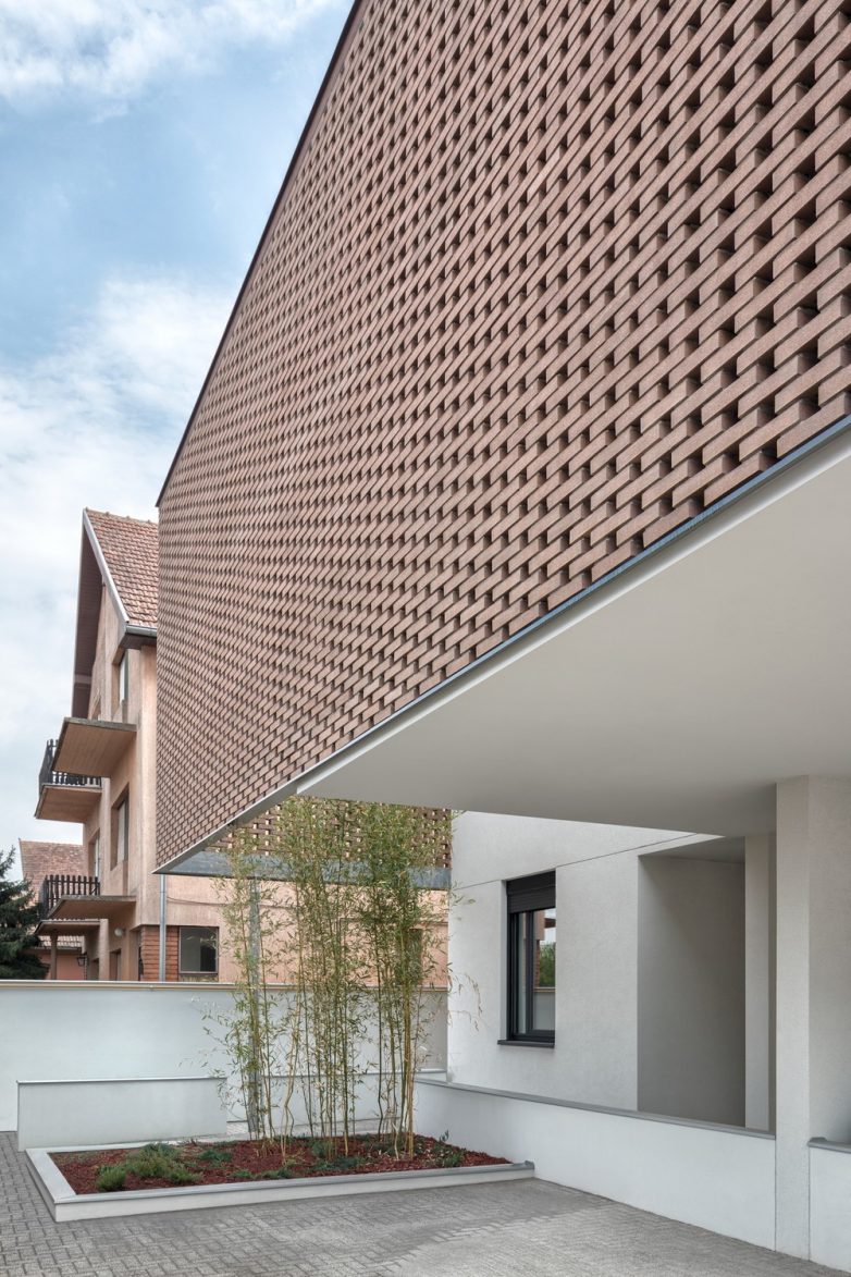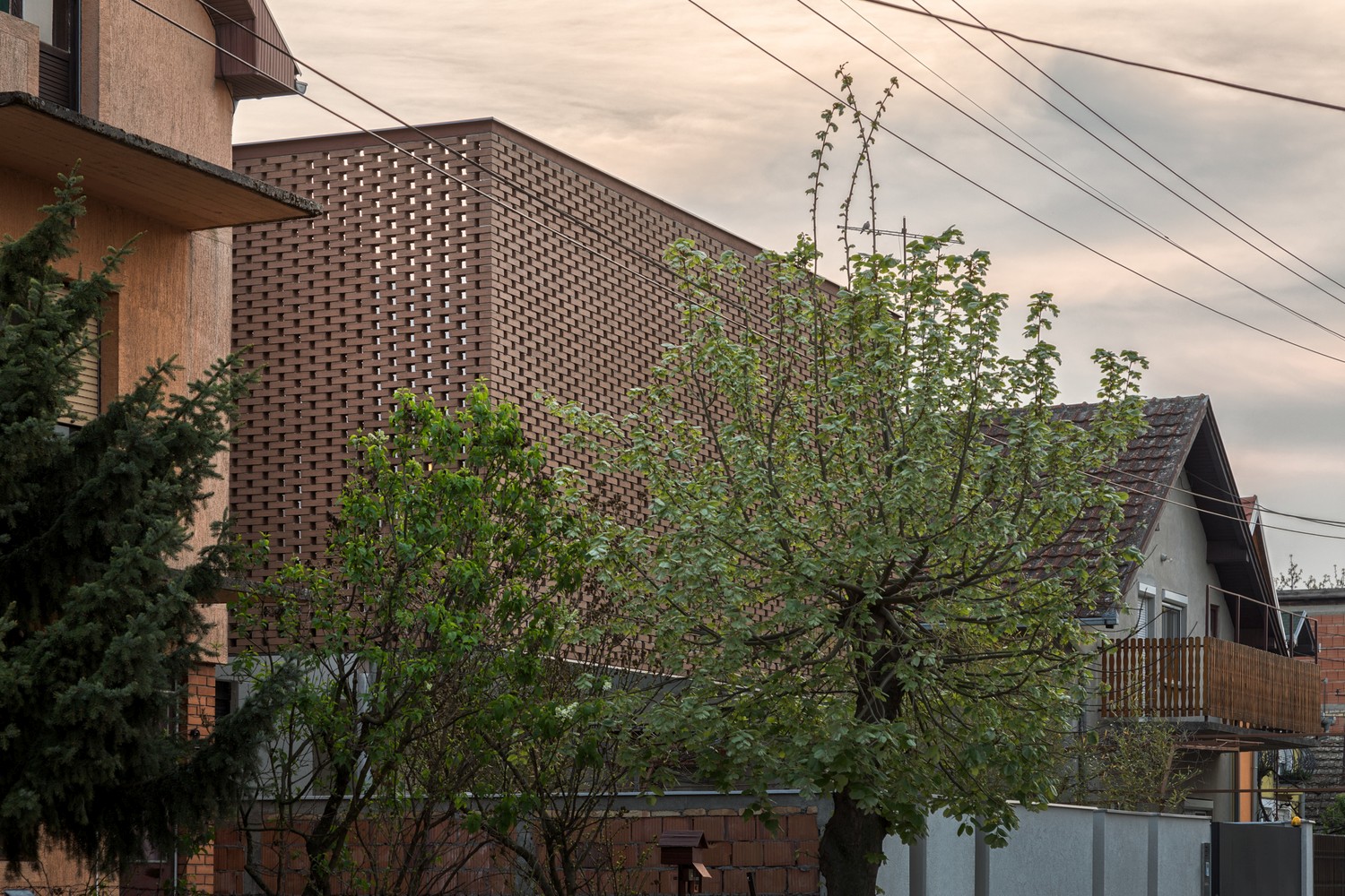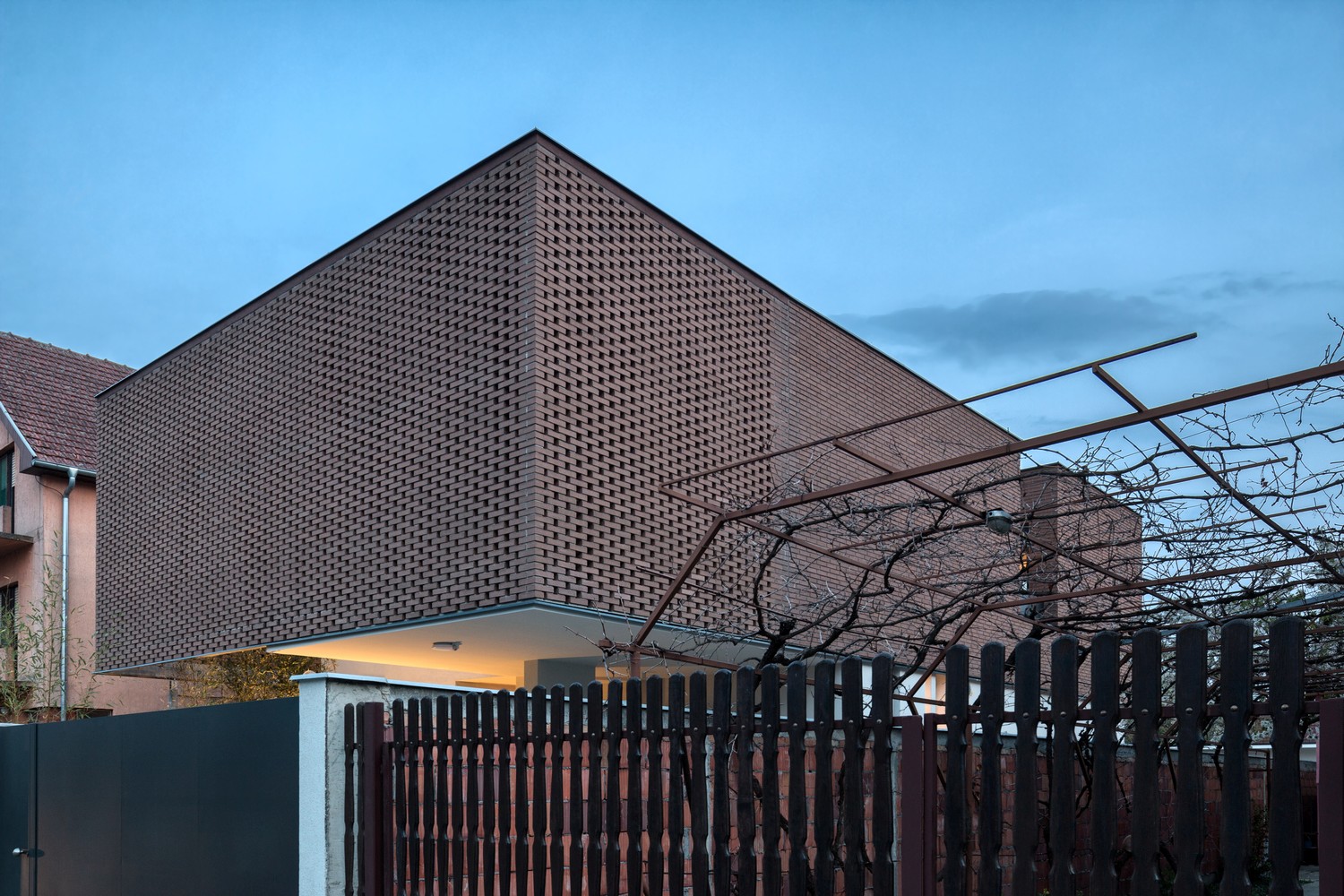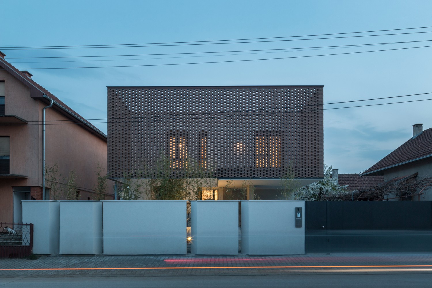 Nesvakidašnja membrana na pročelju definiše identitet kuće čineći suptilnu referencu na tradiciju narodnog graditeljstva ujedno aludirajući i na okolni ambijent.