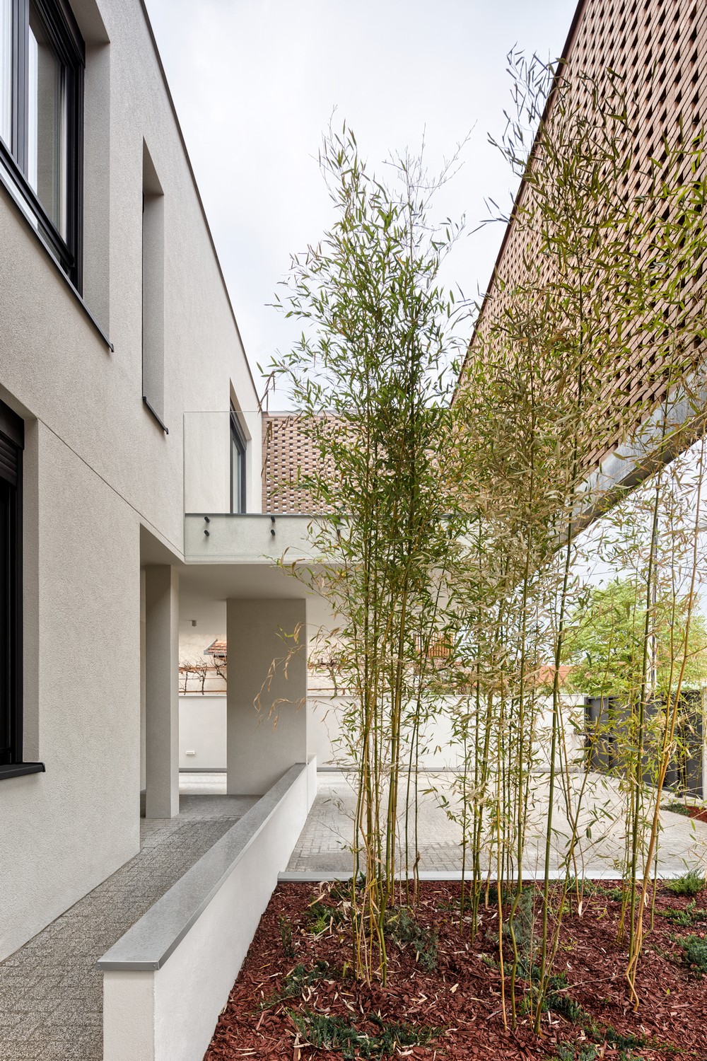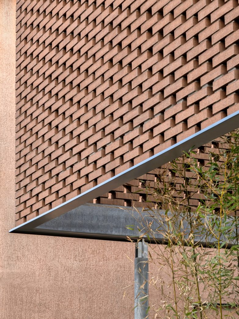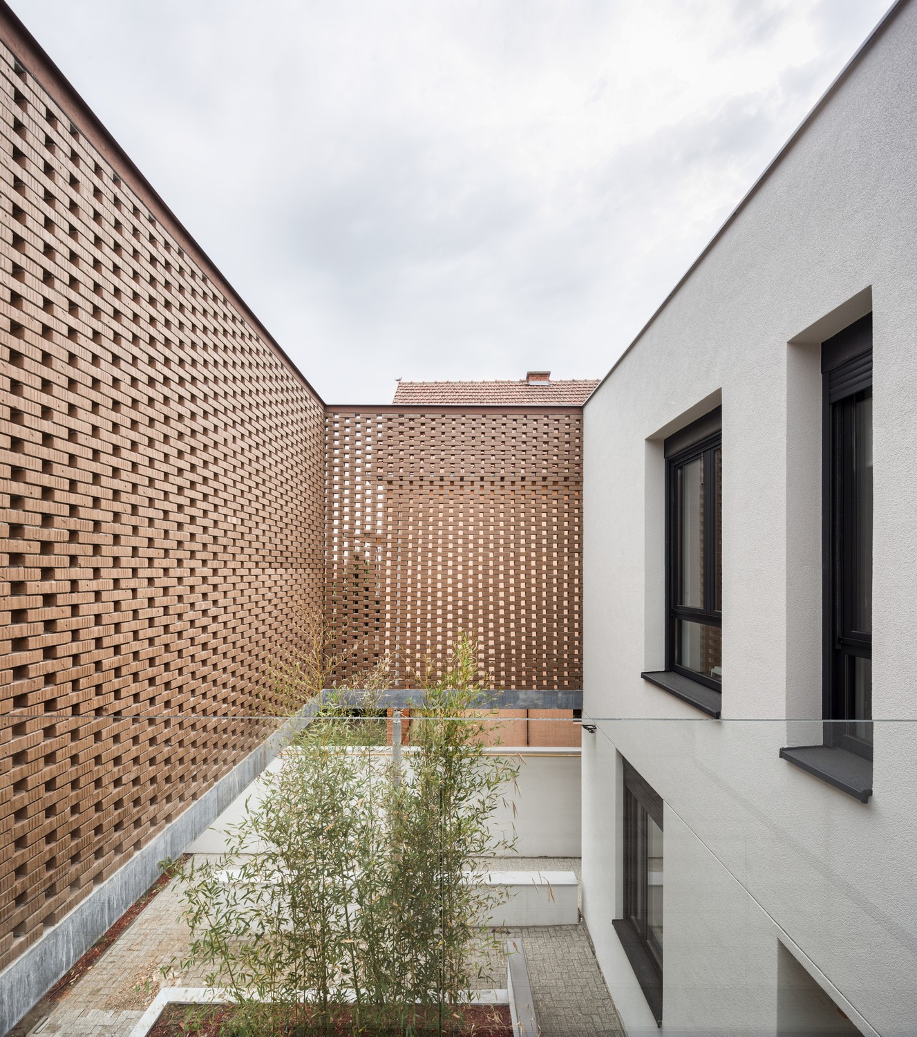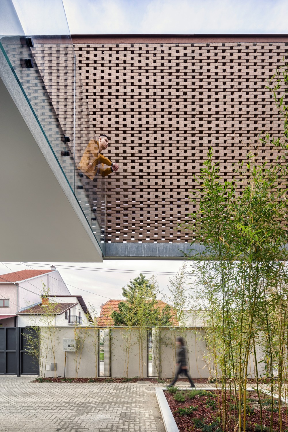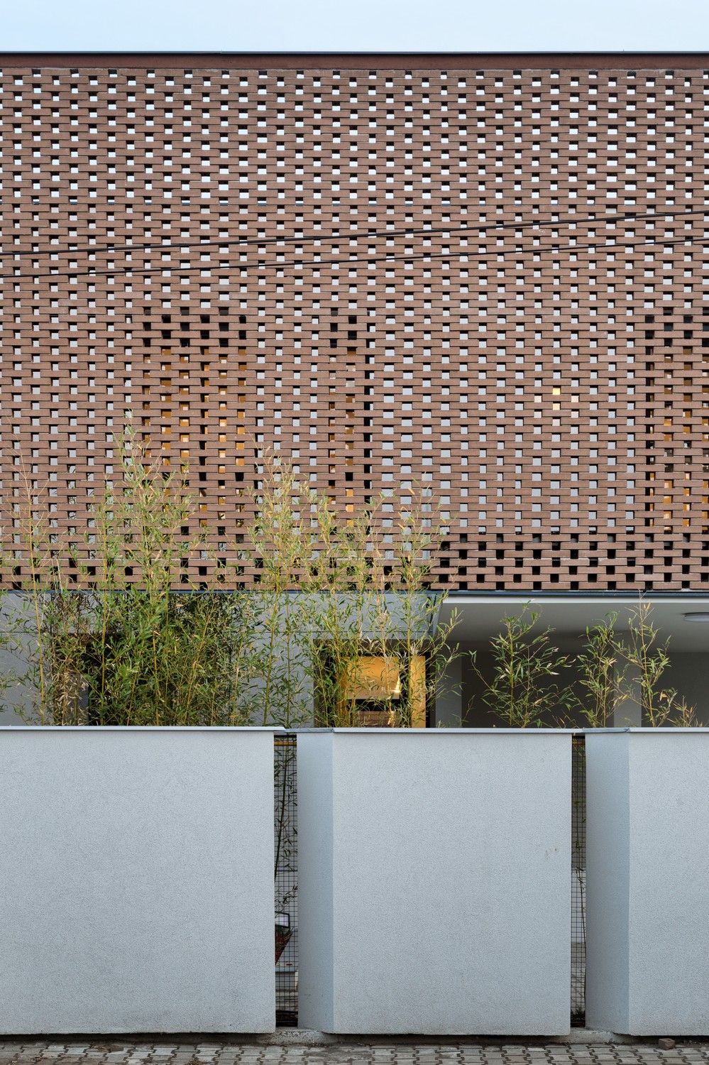 Perforirana struktura čipke prelazi u punu fasadnu opeku na spratu, dok je prizemlje rešeno u belom tonu. Toplu gamu opeke na spratu dopunjuju je svetlo zeleni tonovi bambusove trske posađene uz ogradu i unutar atrijuma koji formira čipka. Građevina je sa ulične strane u velikoj meri zatvorena u odnosu na okruženje, dok se ka unutrašnjem dvorištu otvara kao produžetak intimnog prostora u kojem porodica provodi slobodno vreme.