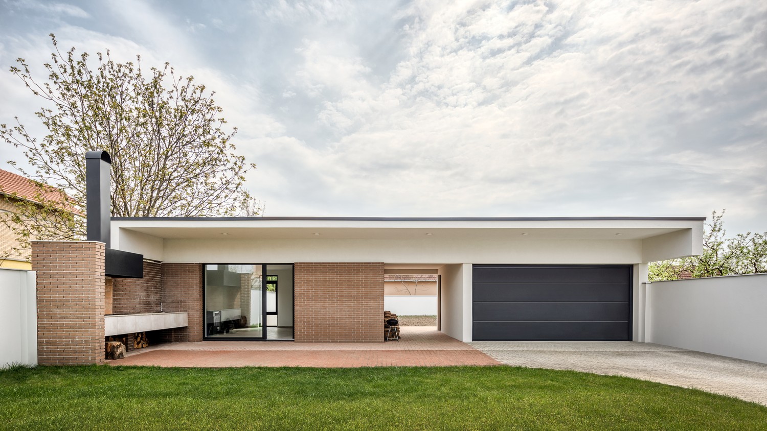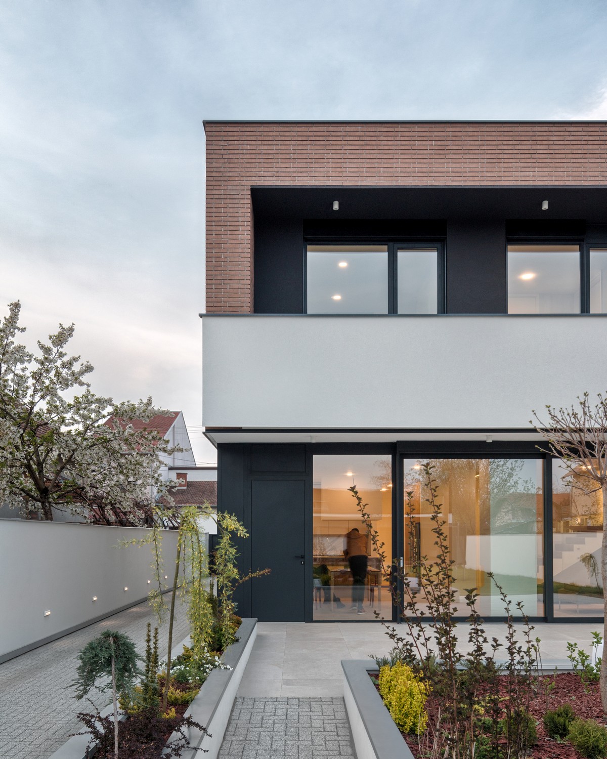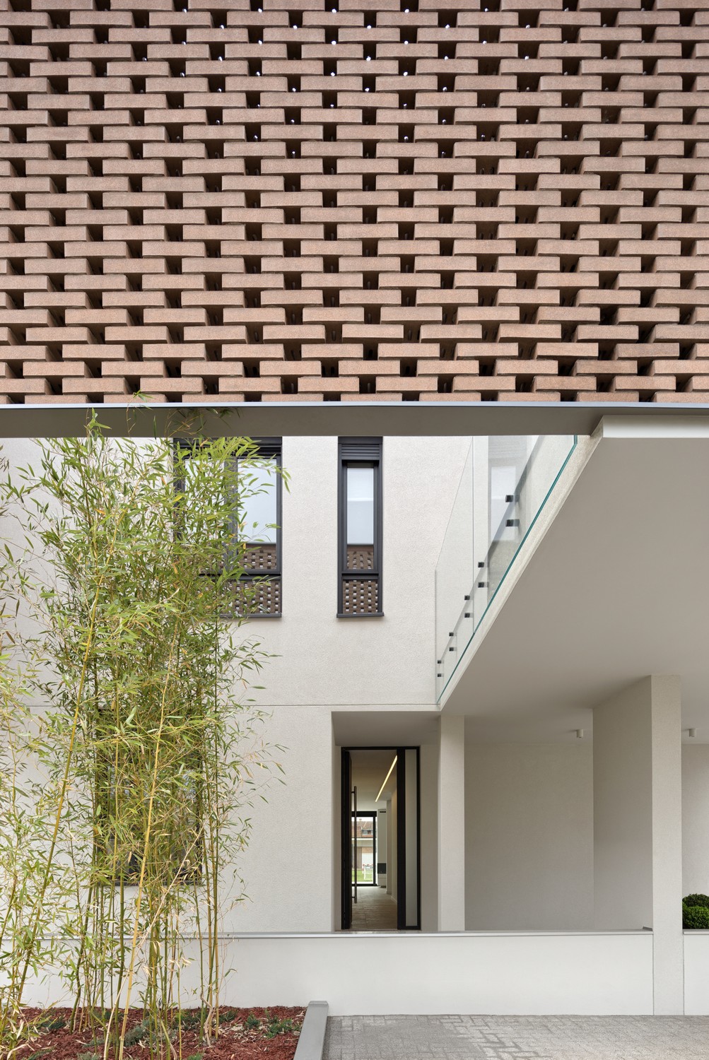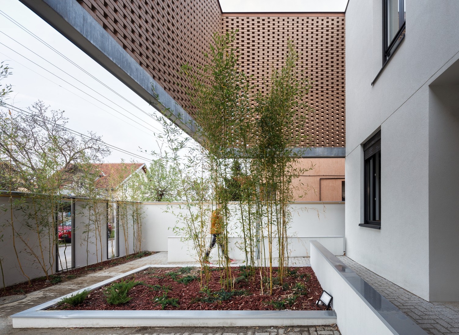 Perforirana struktura čipke prelazi u punu fasadnu opeku na spratu, dok je prizemlje rešeno u belom tonu. Toplu gamu opeke na spratu dopunjuju je svetlo zeleni tonovi bambusove trske posađene uz ogradu i unutar atrijuma koji formira čipka. Građevina je sa ulične strane u velikoj meri zatvorena u odnosu na okruženje, dok se ka unutrašnjem dvorištu otvara kao produžetak intimnog prostora u kojem porodica provodi slobodno vreme.