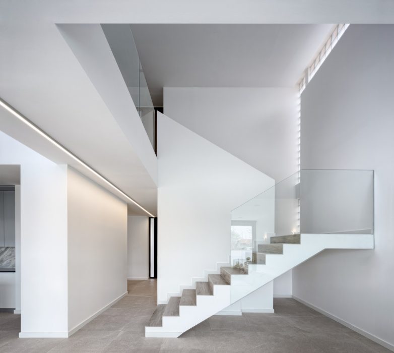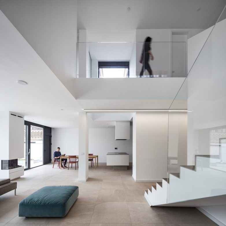 Prostorna organizacija rešena je uobičajenom podelom na dnevnu zonu u prizemlju i noćnu zonu na spratu. Iz ulaznog hola leva vrata vode u radnu sobu, dok su pravo kuhinja, trpezarija i dnevna soba. Ove tri prostorije projektovane su kao jedinstvena celina, koja bi po potrebi mogla jednostavnim uvođenjem pregradnih zidova ili kliznih vrata da se u potpunosti raščlani na nezavisne prostore.