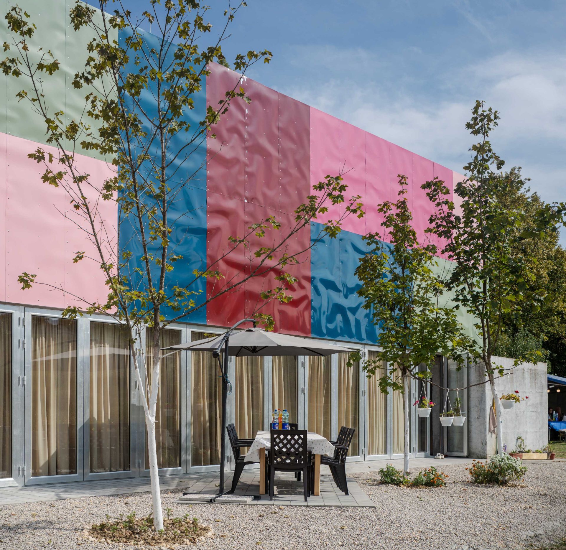 Umetnica Širana Šahbazi radila je sa materijalima i bojama da transformiše fasadu i enterijer u dinamičan vizuelni prikaz – tapiseriju koja neprestano menja izgled. Bojenje i aranžiranje fasadnih panela rađeni su na licu mesta u obližnjoj radionici za farbanje automobila, pretvarajući tako tipičan auto-servis u svojevrsni umetnički atelje.